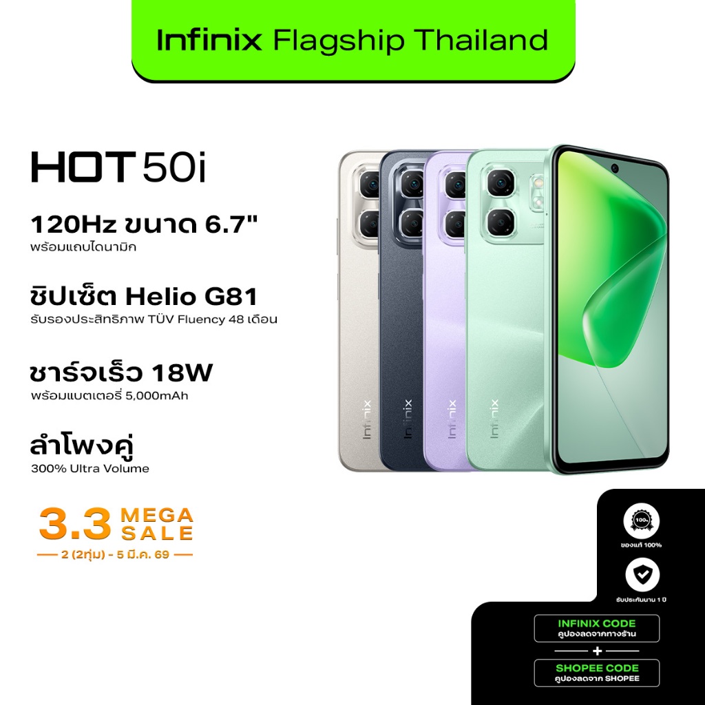 Infinix HOT 50i 256+4GB (เพิ่มแรมสูงสุด 8GB) 120Hz หน้าจอใหญ่ 6.7" Punch-Hole พร้อมแถบไดนามิก I ชิปเซ็ต Helio G81