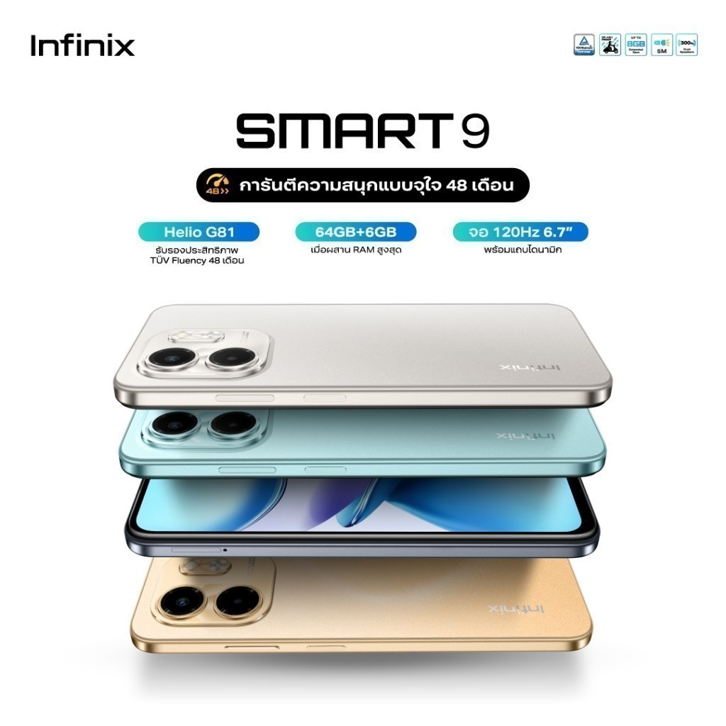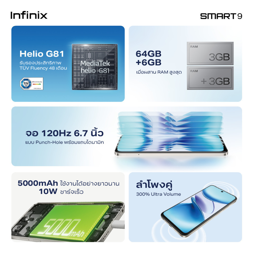 Infinix SMART 9 64+3GB (เพิ่มแรมสูงสุด 6GB) I 120Hz หน้าจอใหญ่ 6.7" Punch-Hole I ชิปเซ็ต Helio G81 I ลำโพงคู่