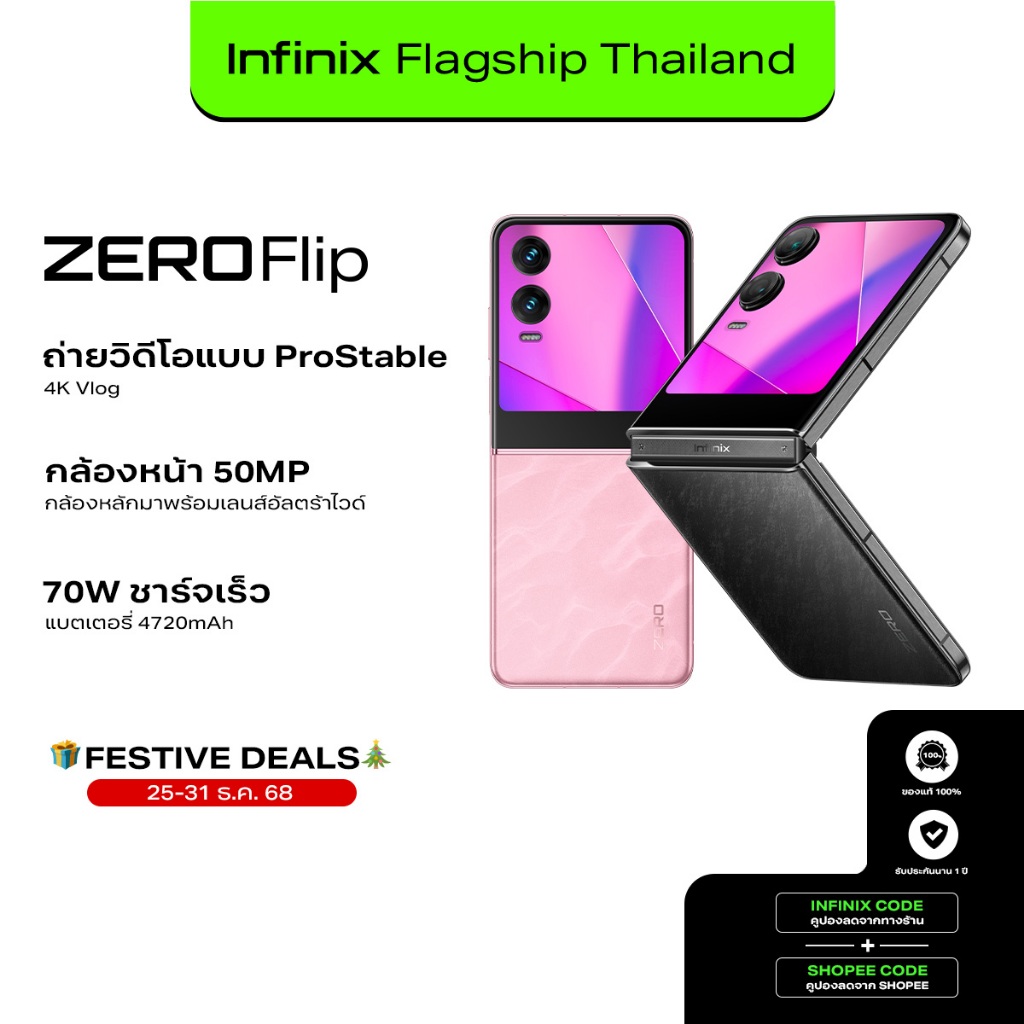 Infinix ZERO Flip 512+8GB (เพิ่มแรมสูงสุด 16GB) I ถ่ายวีดีโอ Pro-Stable 4K Vlog กล้องหน้า 50MP I ชิปเซ็ต D8020 5G