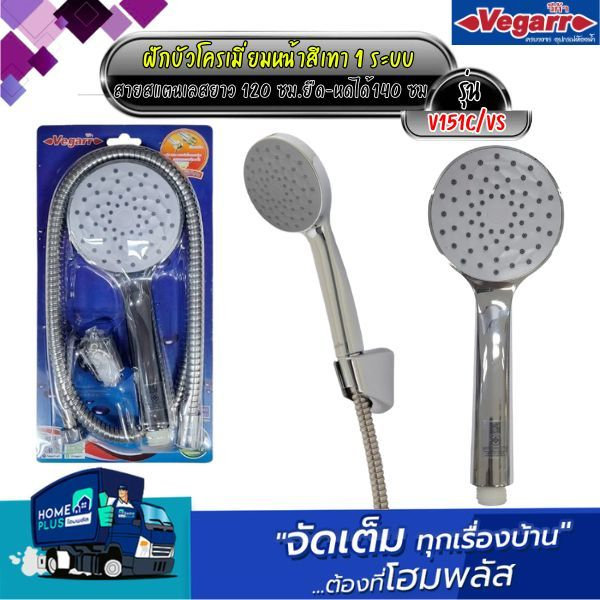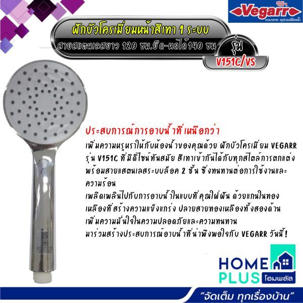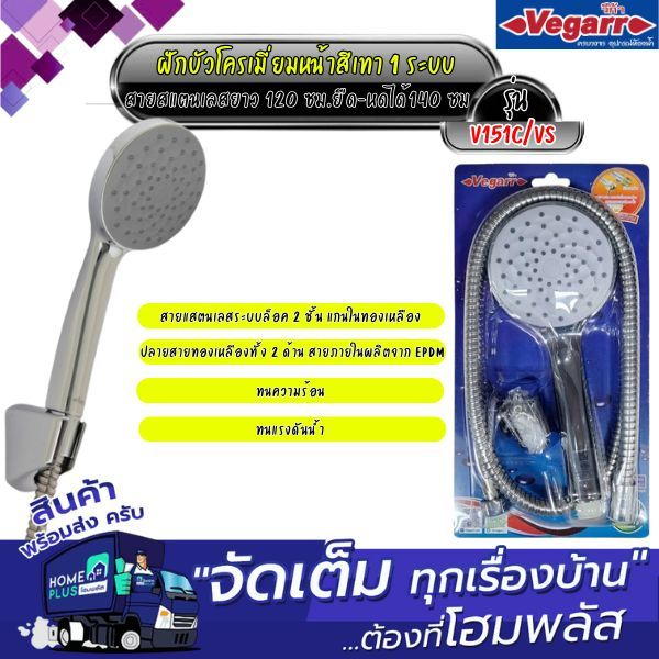 VEGARR ฝักบัวโครเมี่ยมหน้าสีเทา 1 ระบบ พร้อมสายสแตนเลสยาว 120 ซม.ยืด-หดได้140 ซม.ถ้วย+น็อตทองเหลือง 2 ด้าน V151C/VS