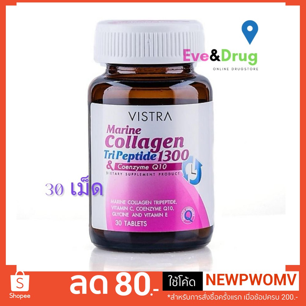 Vistra Marine Collagen Tri peptide 1300 Plus coenzyme Q10 30 Tablets วิสทร้า มารีน คอลลาเจน ไตรเปปไทด์