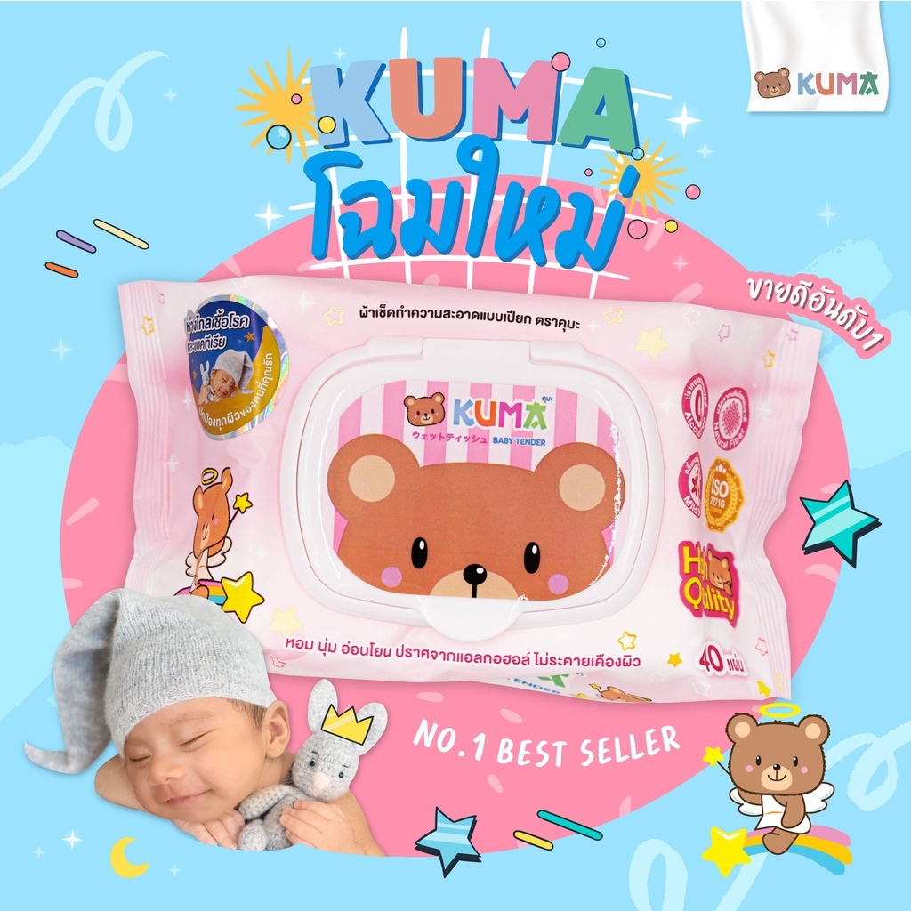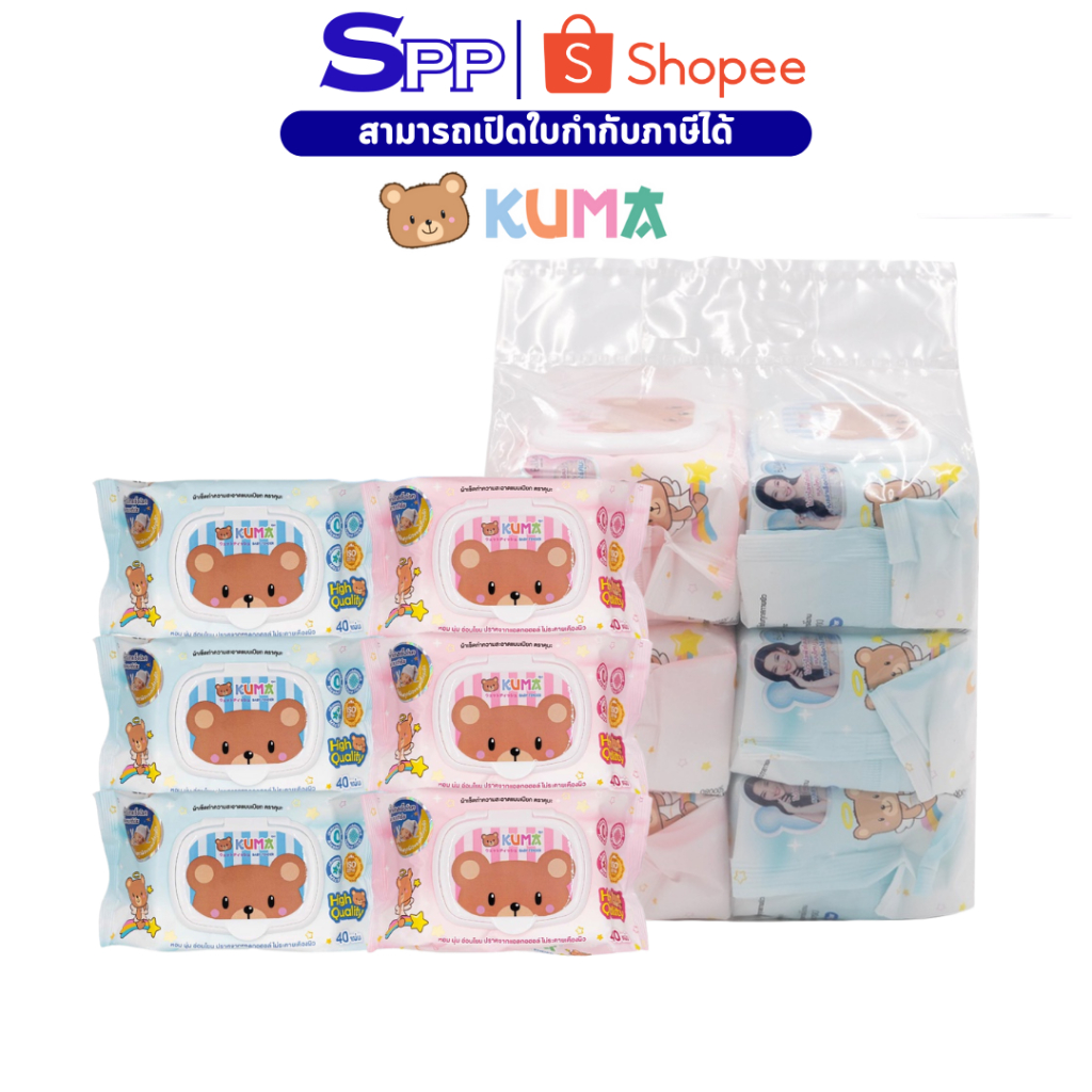 KUMA ทิชชู่เปียก ทิชชู่เปียกคุมะ รุ่นฝาปิด 40 แผ่น แพ็ค 6 ห่อ