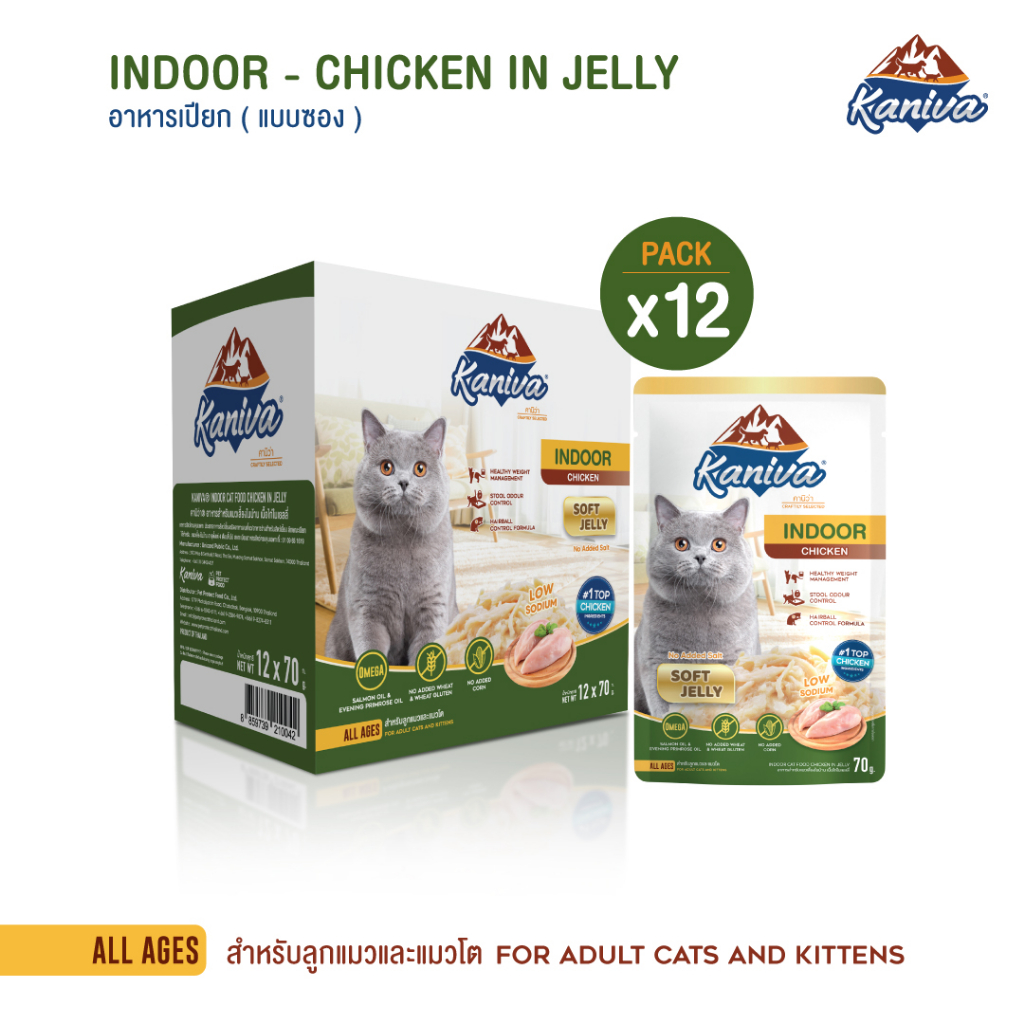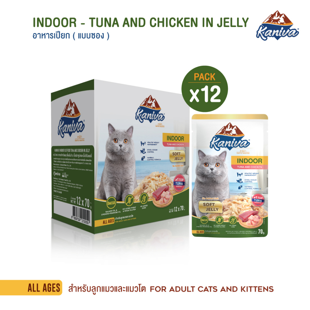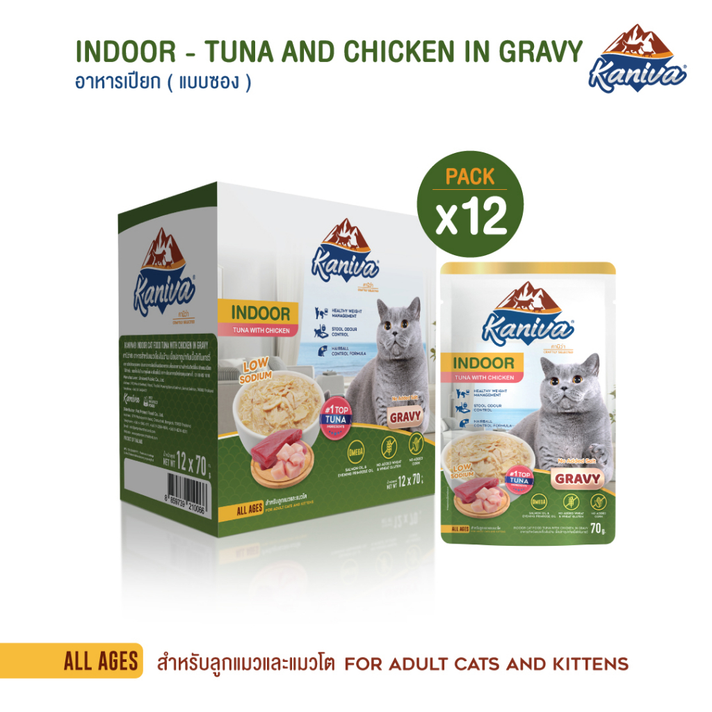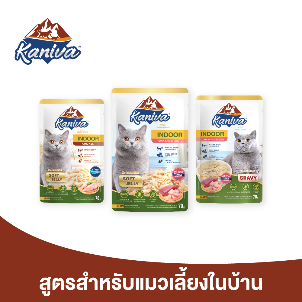 (12 ซอง) Kaniva Indoor Pouch อาหารแมวคานิว่า ชนิดเปียก ช่วยควบคุ มน้ำหนัก ลดกลิ่นมูล ขนาด 70 กรัม