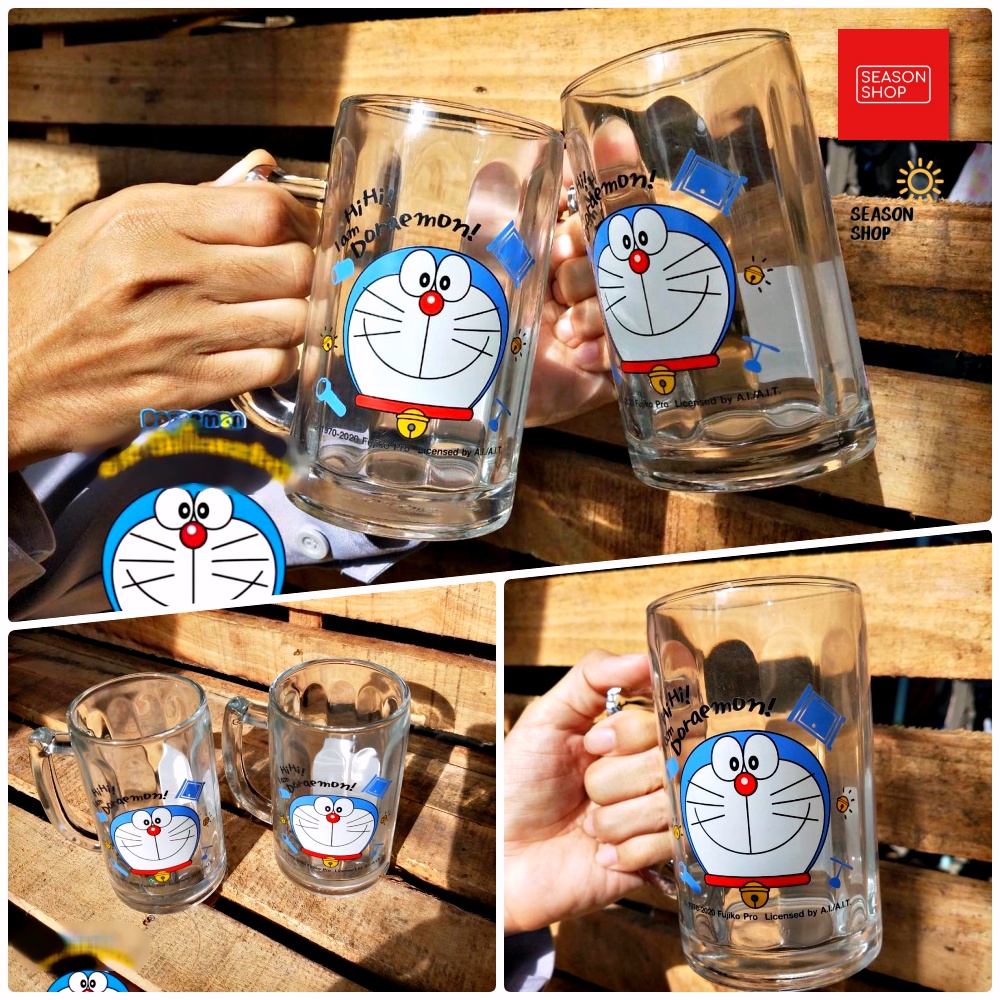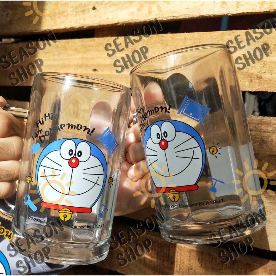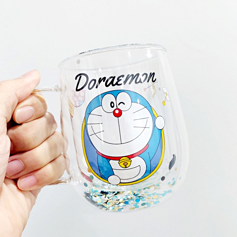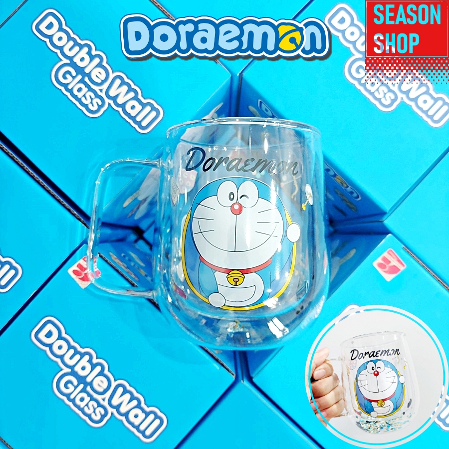 seasonshop แก้วน้ำ การ์ตูน โดเรม่อน มีหูจับ เนื้อหนา ใส่นม แก้วสองชั้น ใส มีกากเพชร ลิขสิทธิ์