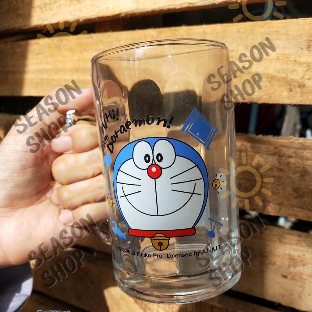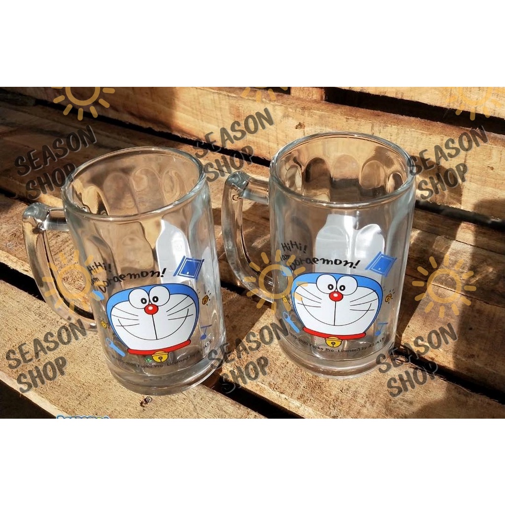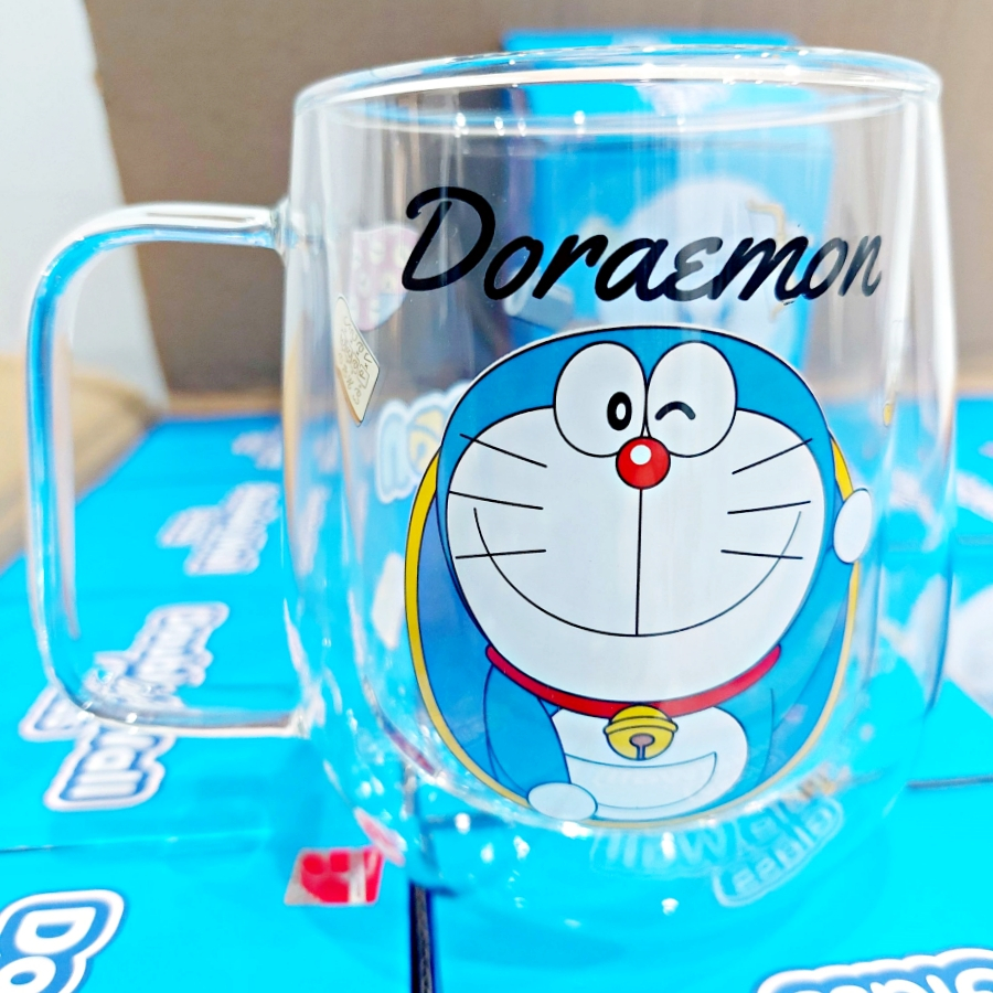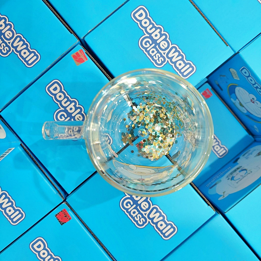 seasonshop แก้วน้ำ การ์ตูน โดเรม่อน มีหูจับ เนื้อหนา ใส่นม แก้วสองชั้น ใส มีกากเพชร ลิขสิทธิ์