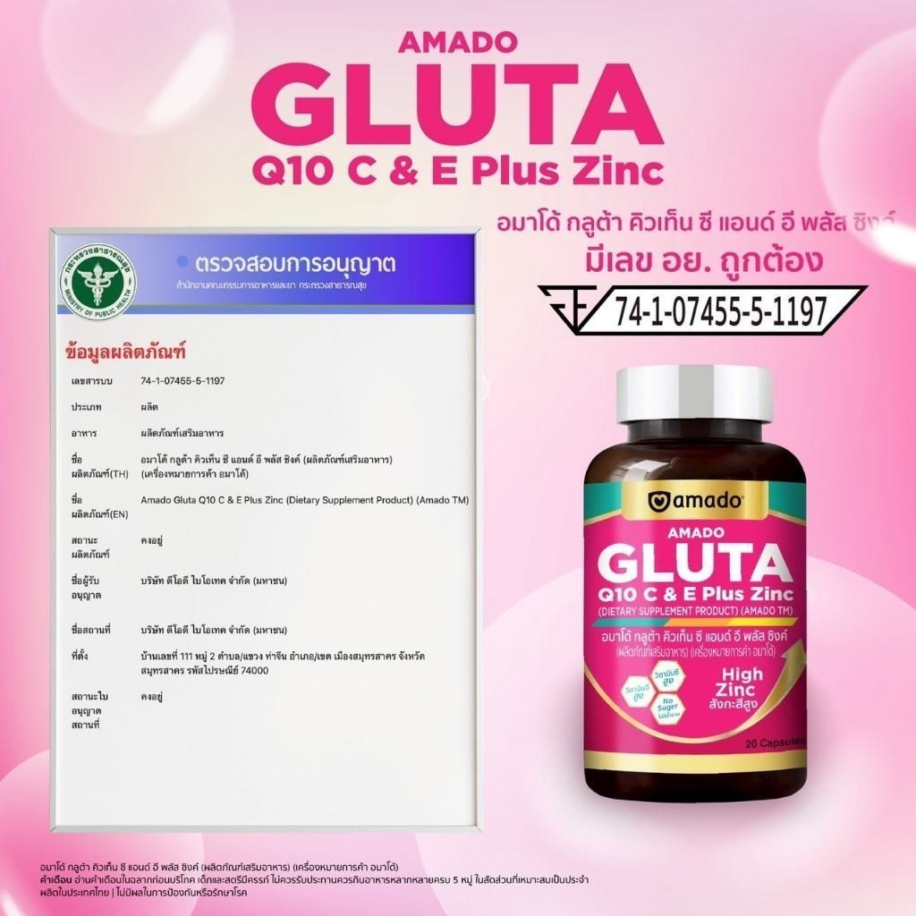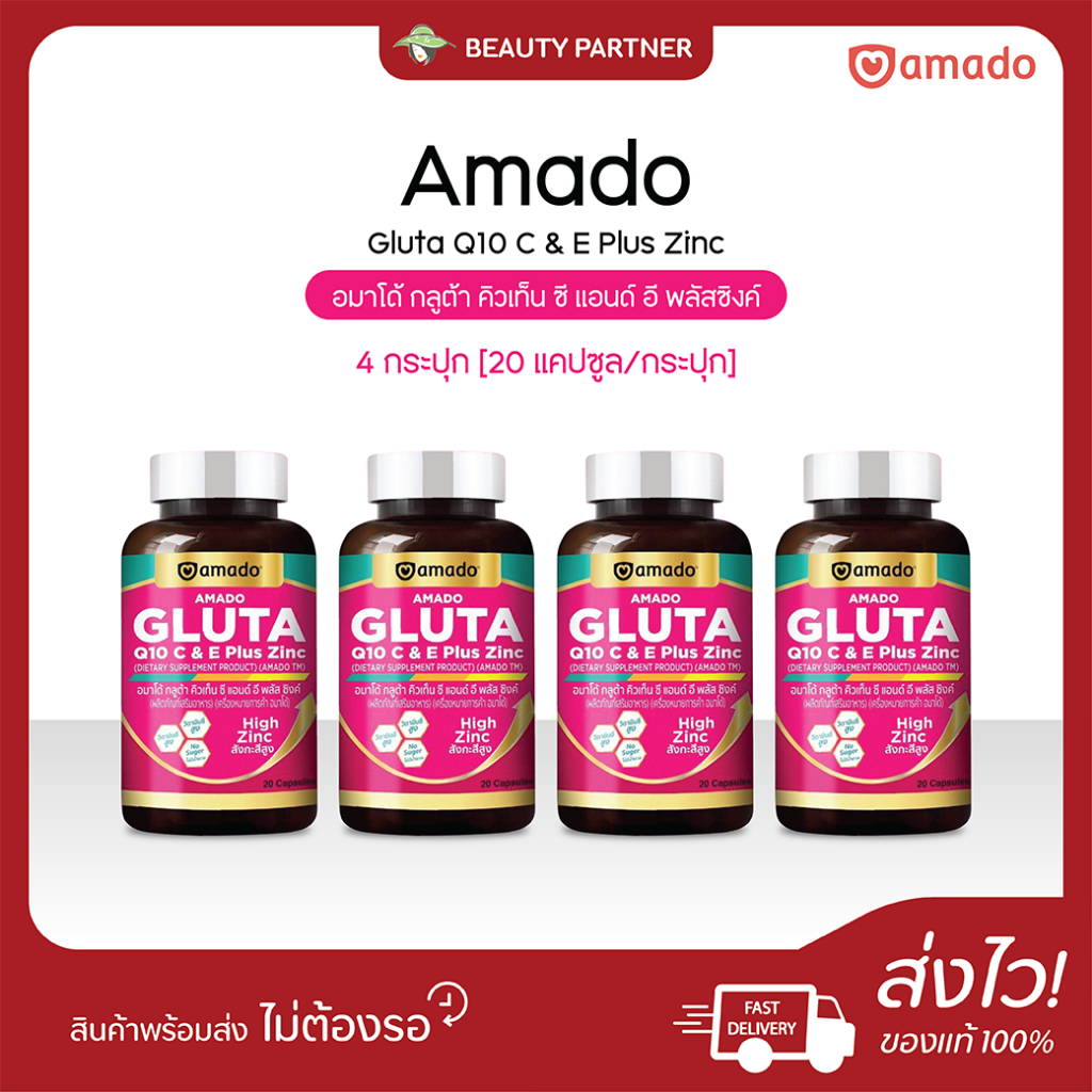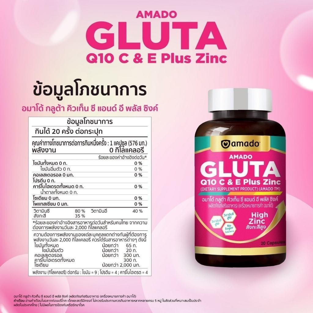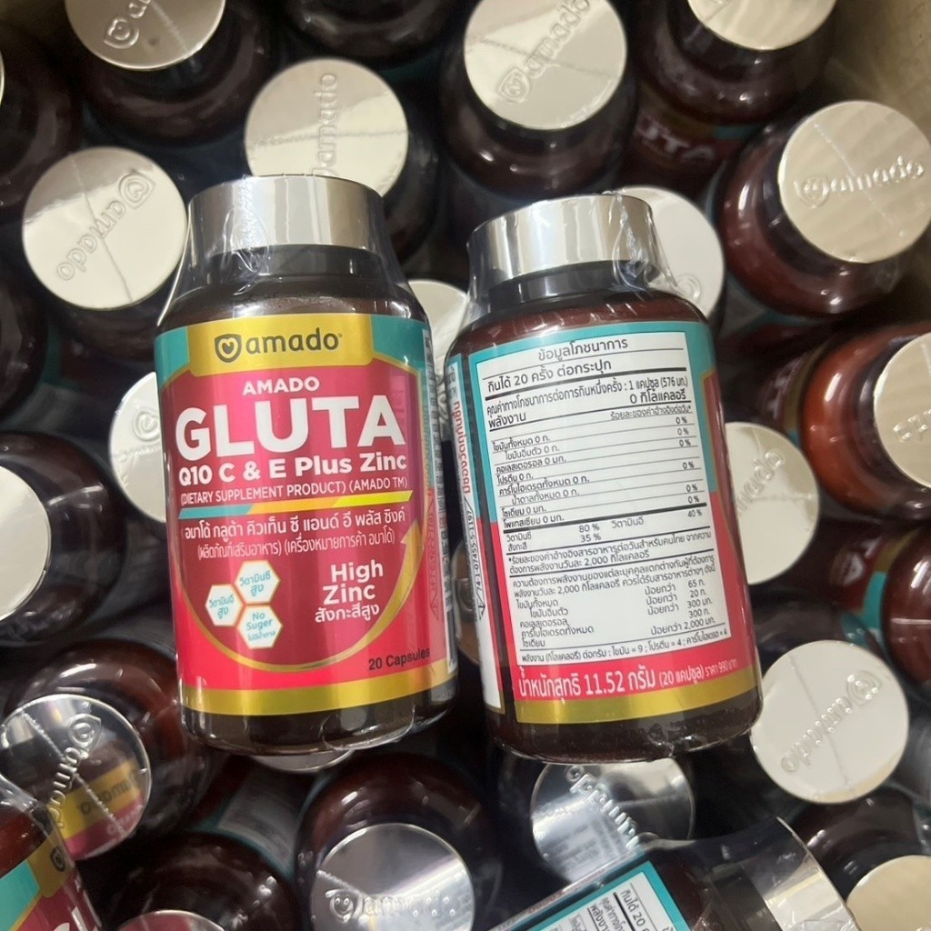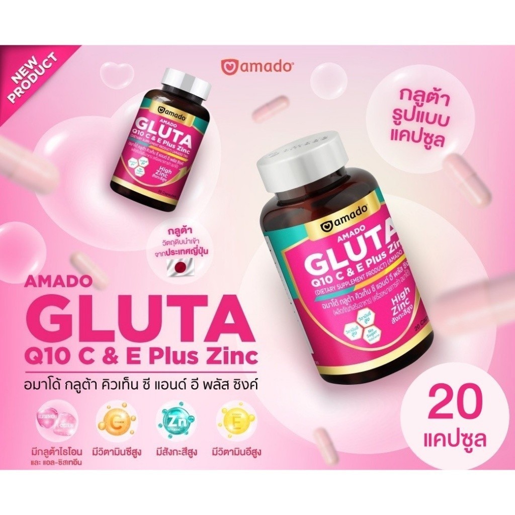 Amado Gluta Q10 C & E Plus Zinc อมาโด้ กลูต้า คิวเท็น ซี แอนด์ อี พลัสซิงค์ [20 แคปซูล] [4 กระปุก] กลูต้าแบบเม็ด ทานง่าย