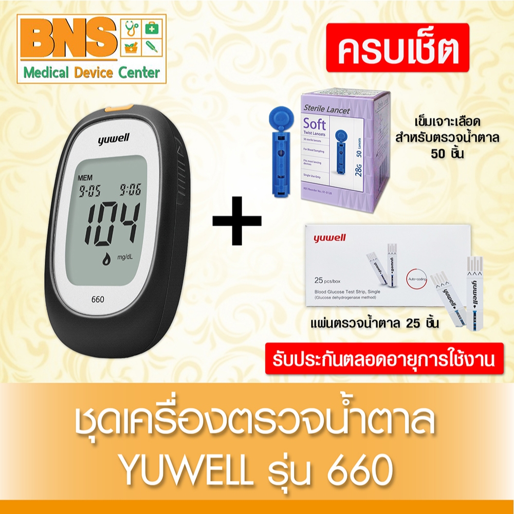 (สินค้าใหม่มีประกัน)YUWELL ชุดตรวจน้ำตาล ครบเซ็ต เครื่องตรวจน้ำตาล รุ่น 660+แผ่นตรวจน้ำตาล 25 ชิ้น+เข็มเจาะเลือด 50 ชิ้น