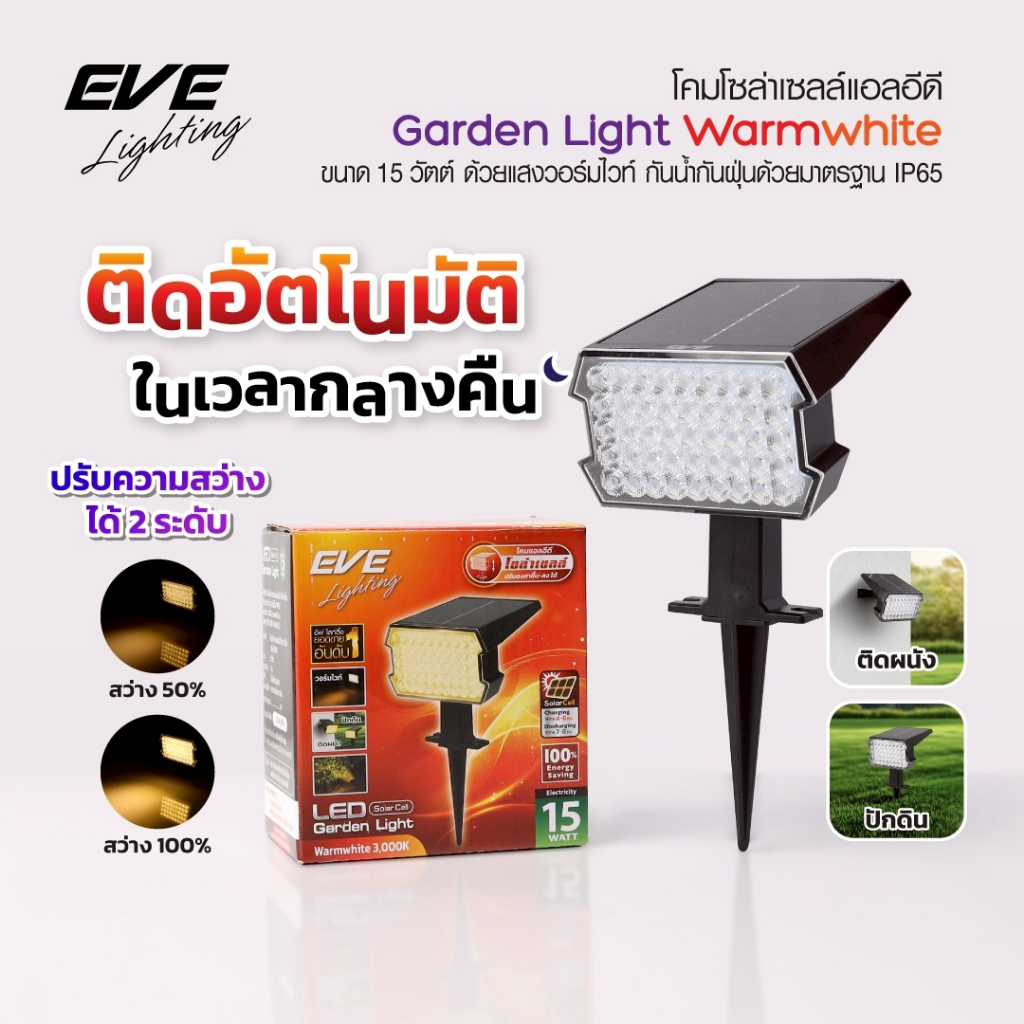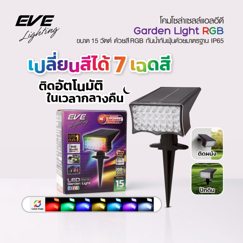 EVE โคมไฟโซล่าเซลล์ LED ปักดิน ติดผนัง ตั้งพื้น 15 วัตต์ แสงวอร์มไวท์ 3000K และ RGB