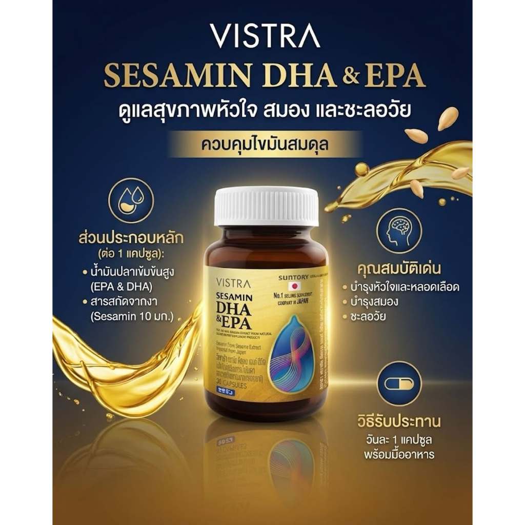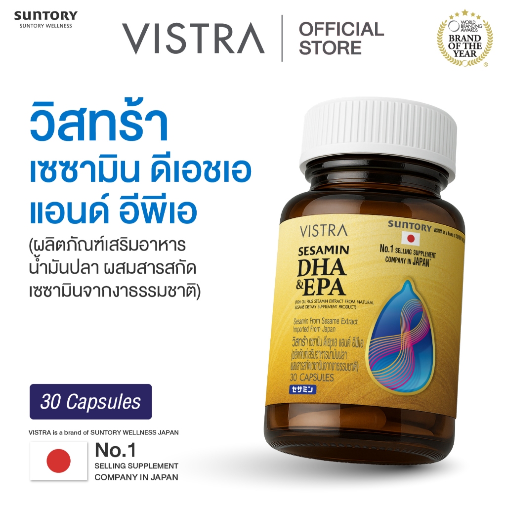 Vistra Sesamin DHA & EPA Fish Oil + Sesamin Extract วิสทร้า เซซามิน ดีเอชเอ อีพีเอ น้ำมันปลา ผสมสารสกัดงา [30 แคปซูล]