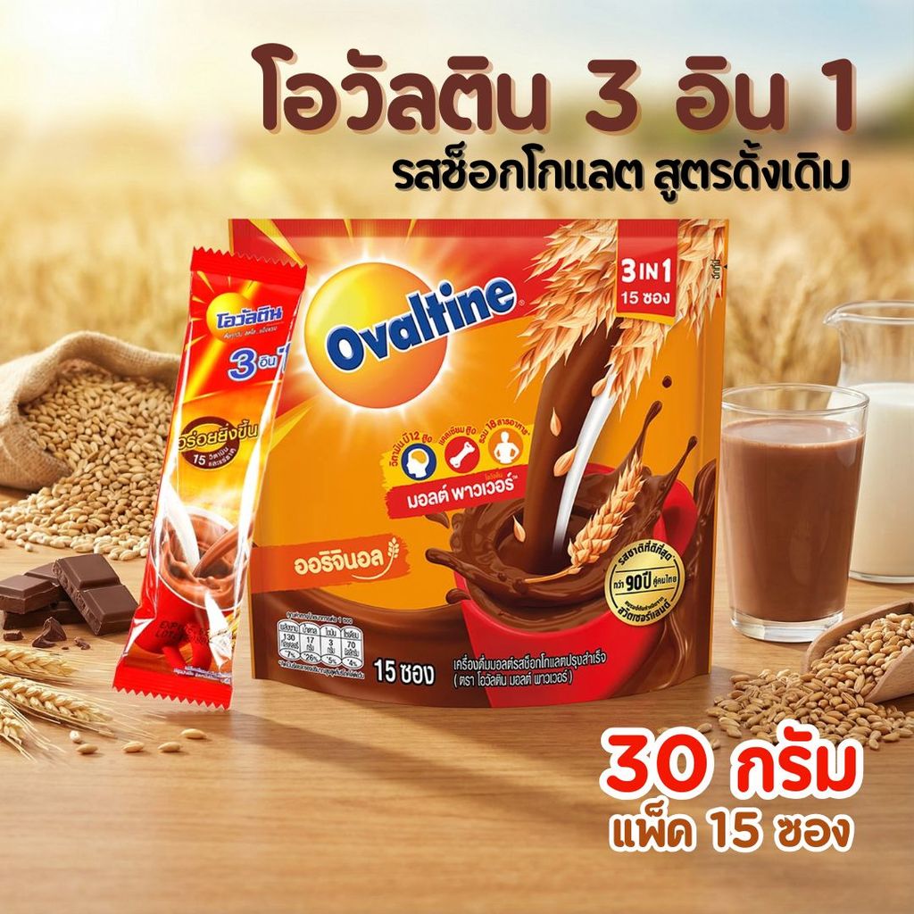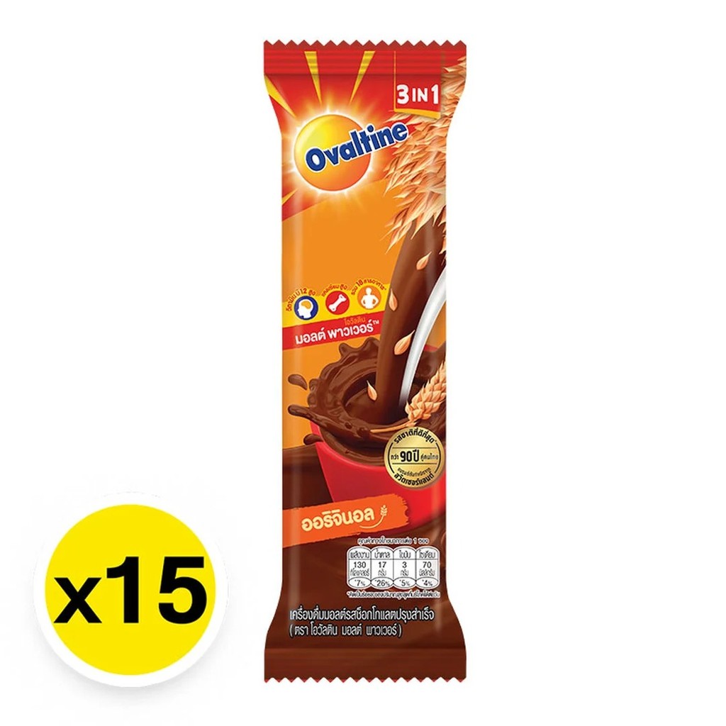 Ovaltine โอวัลติน 3 อิน 1 เครื่องดื่มมอลต์สกัด รสช็อกโกแลต สูตรดั้งเดิม (30 กรัม แพ็ค 15 ซอง)