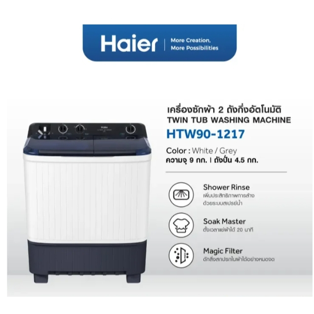 ราคาพิเศษHaier เครื่องซักผ้า 2 ถัง รุ่น HTW90 1217 (ซัก 9.0กก./ปั่น 4.5 กก.)รับประกันมอเตอร์ซัก12ปีตัวเครื่อง 1ปี แถมขา1