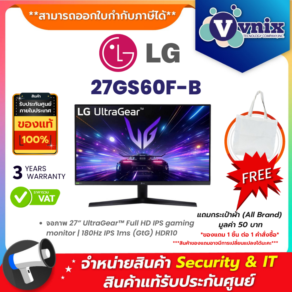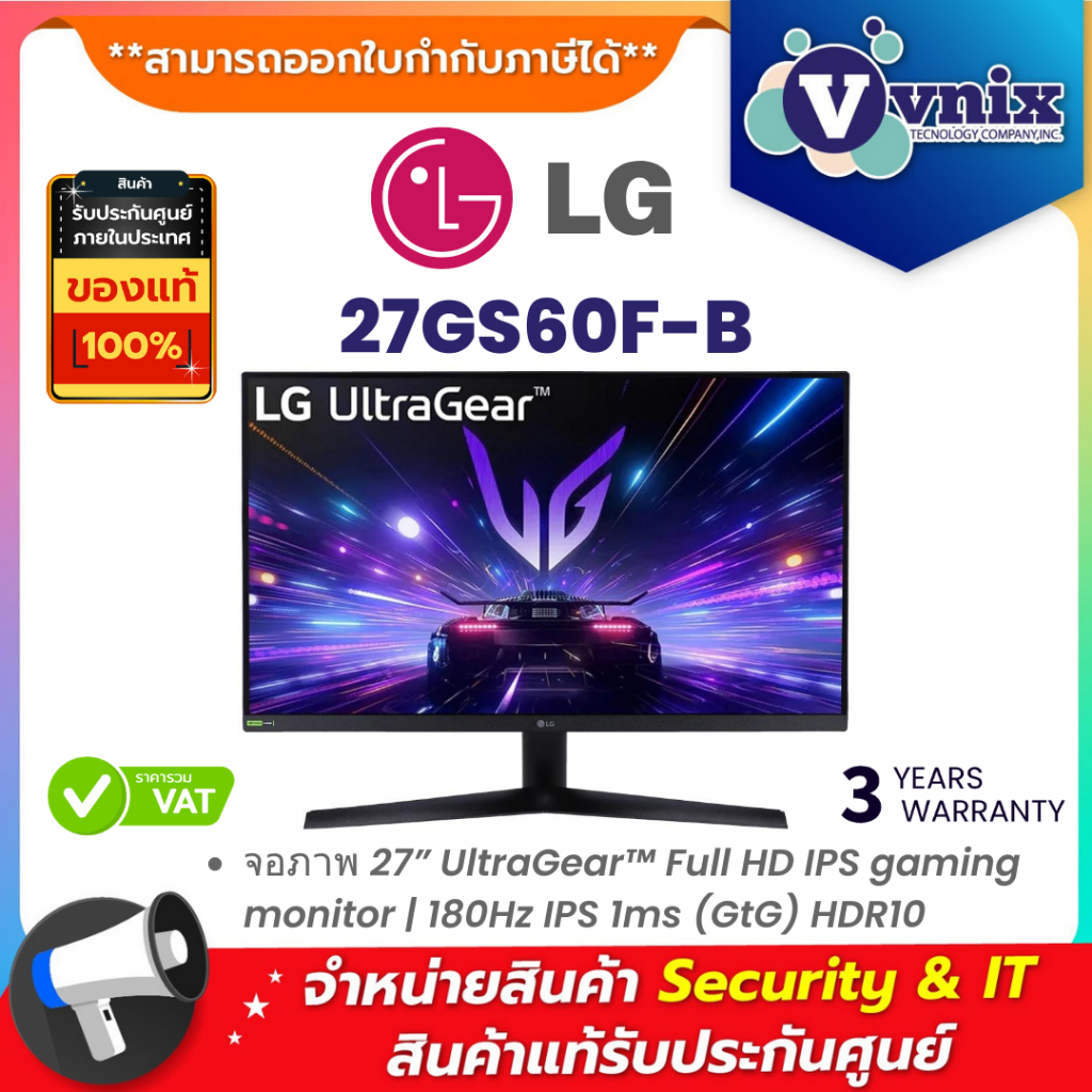 LG 27GS60F-B จอภาพ 27” UltraGear™ Full HD IPS gaming monitor | 180Hz IPS 1ms (GtG) HDR10 By Vnix Group