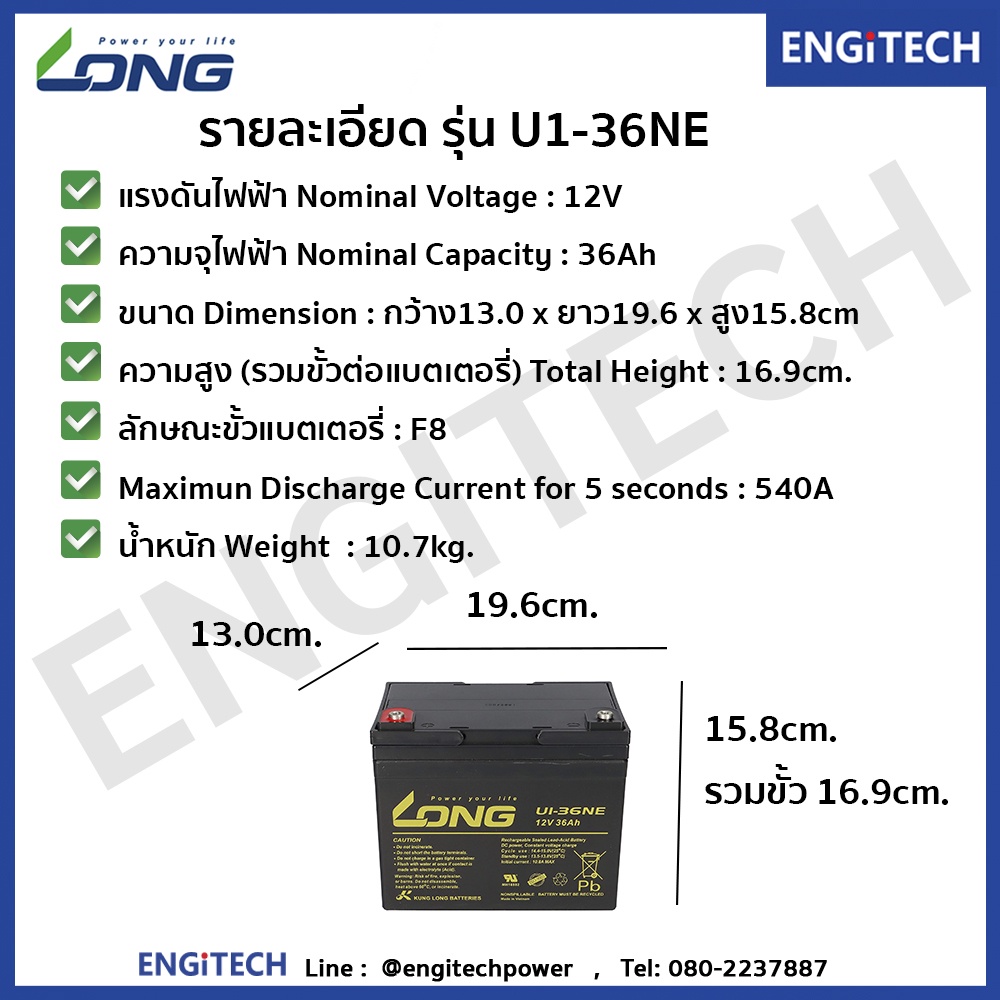 LONG แบตเตอรี่ แห้ง U1-36NE ( 12V 36Ah ) แบต เครื่อง สำรอง ไฟ UPS ไฟฉุกเฉิน รถไฟฟ้า