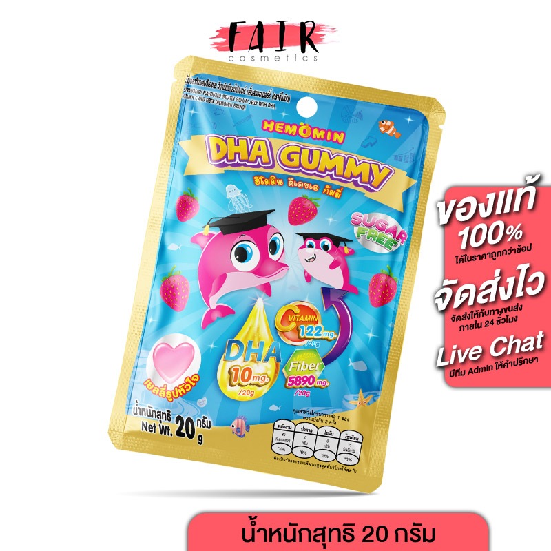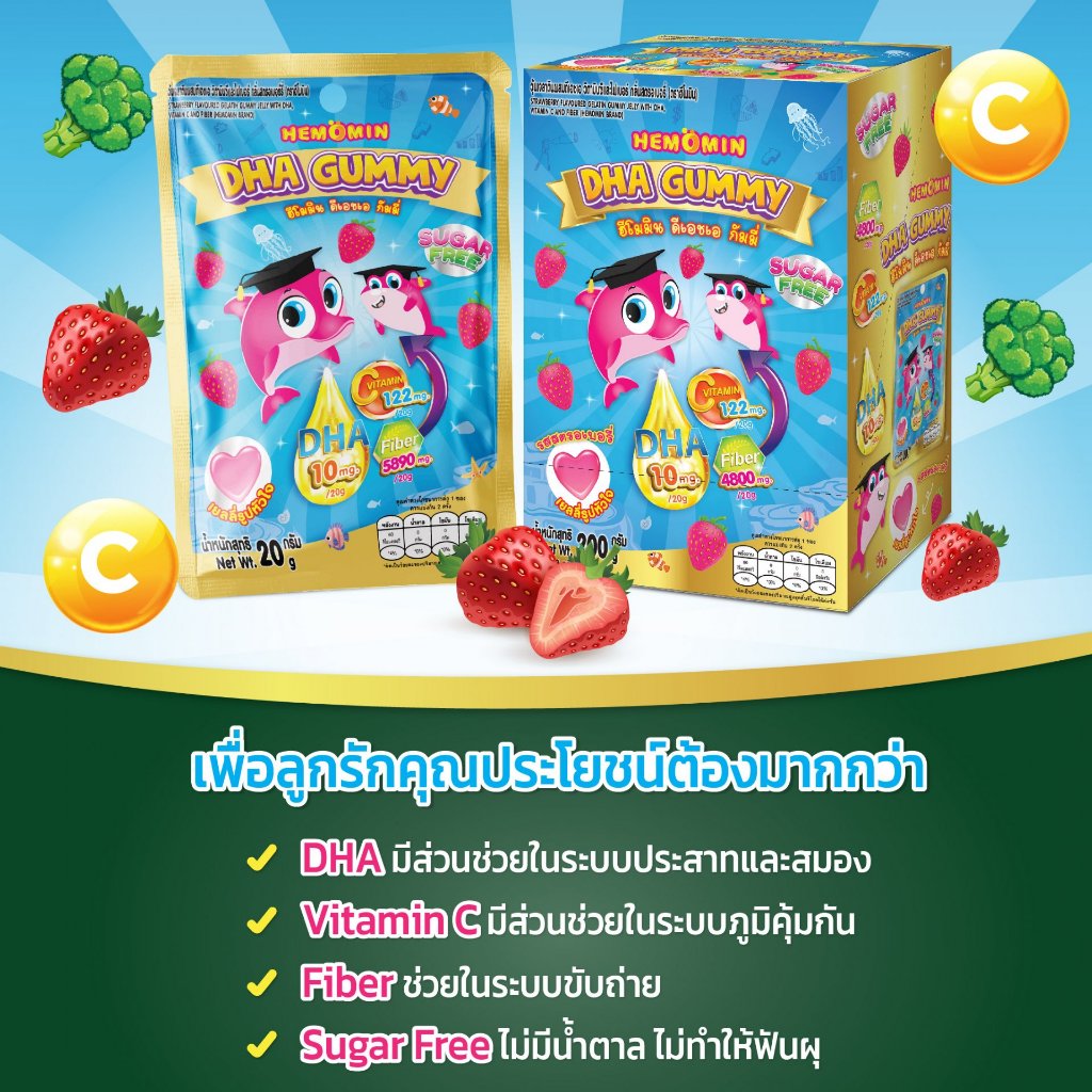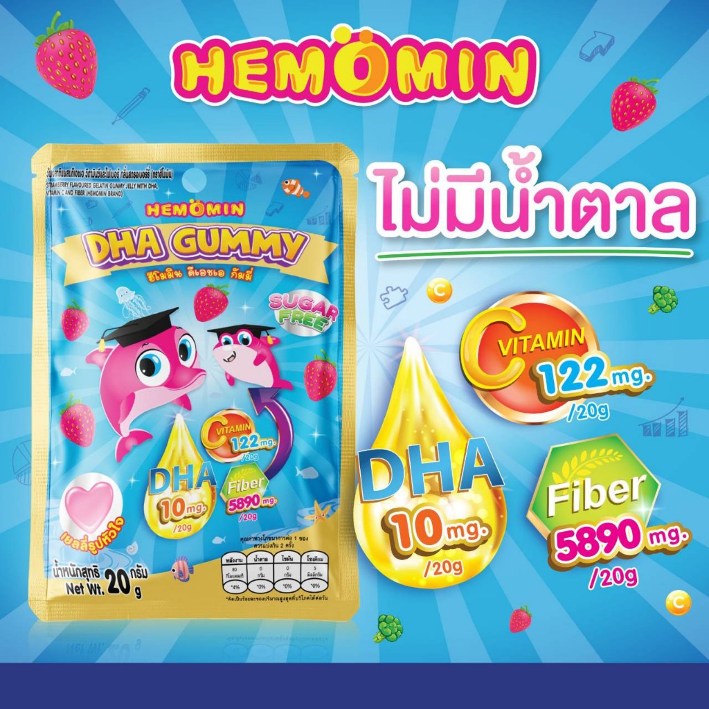 Hemomin DHA Gummy ฮีโมมิน ดีเอชเอ กัมมี่ [1 ซอง] เจลลี่ ดีเอชเอ วิตามินซีและไฟเบอร์ กลิ่นสตรอว์เบอร์รี่