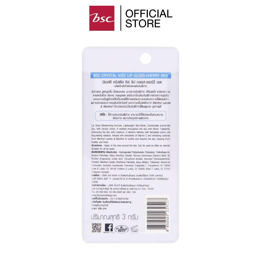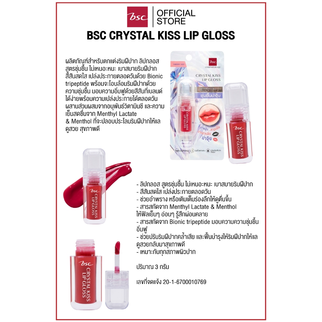 BSC CRYSTAL KISS LIP GLOSS # CHERRY RED ผลิตภัณฑ์สำหรับตกแต่งริมฝีปาก ลิปกลอสสูตรชุ่มชื้นไม่เหนอะหนะ