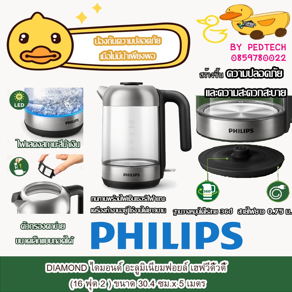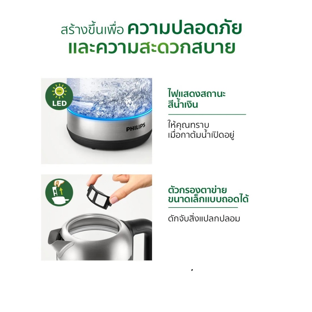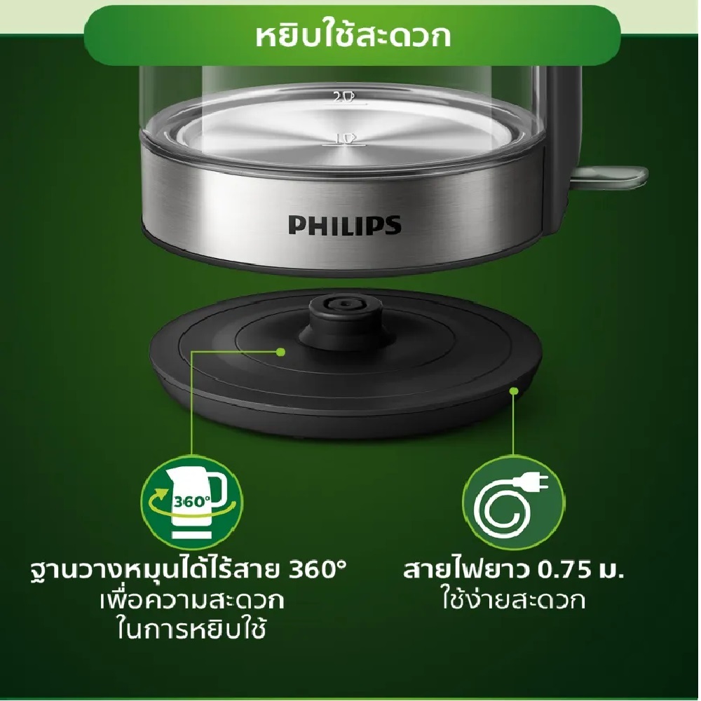PHILIPS กาต้มน้ำไฟฟ้า 2200 วัตต์, 1.7 ลิตร รุ่น HD9339/80 เเก้วใส มีไฟสีฟ้าเวลาต้มด้วย