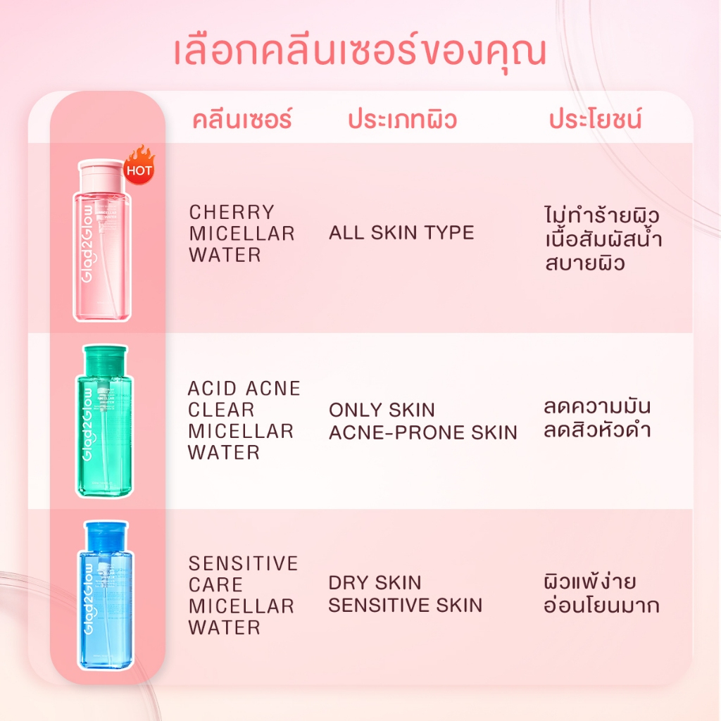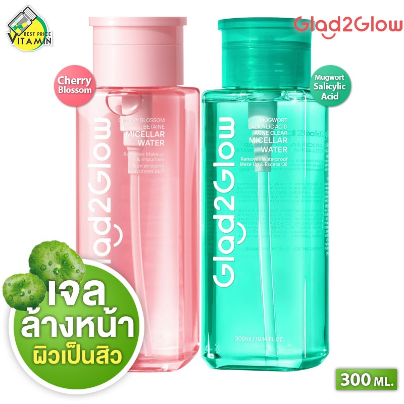 Glad2Glow Micellar Water Cherry Blossom Betaine/Mugwort Salicylic Acid Acne Clear แกลดทูโกลว์ ไมเซลล่า วอเตอร์ [300 ml.]