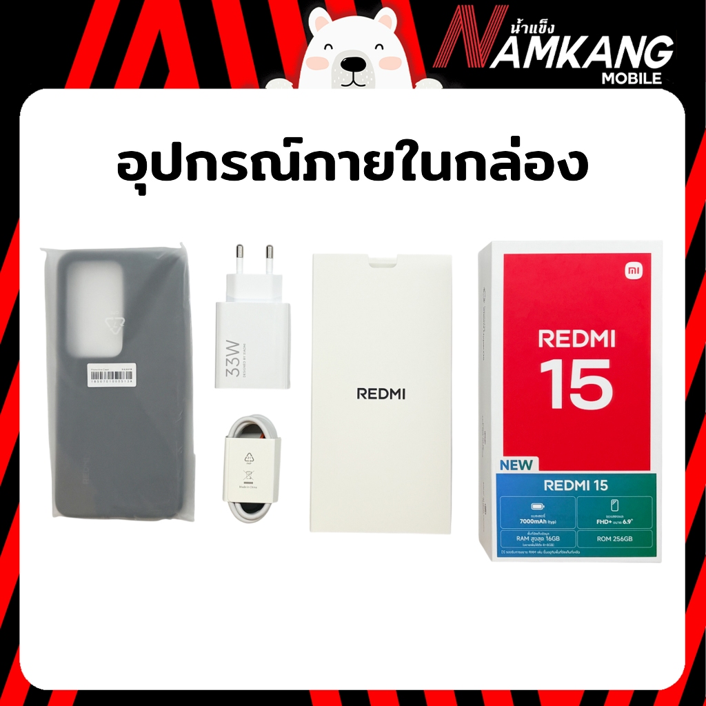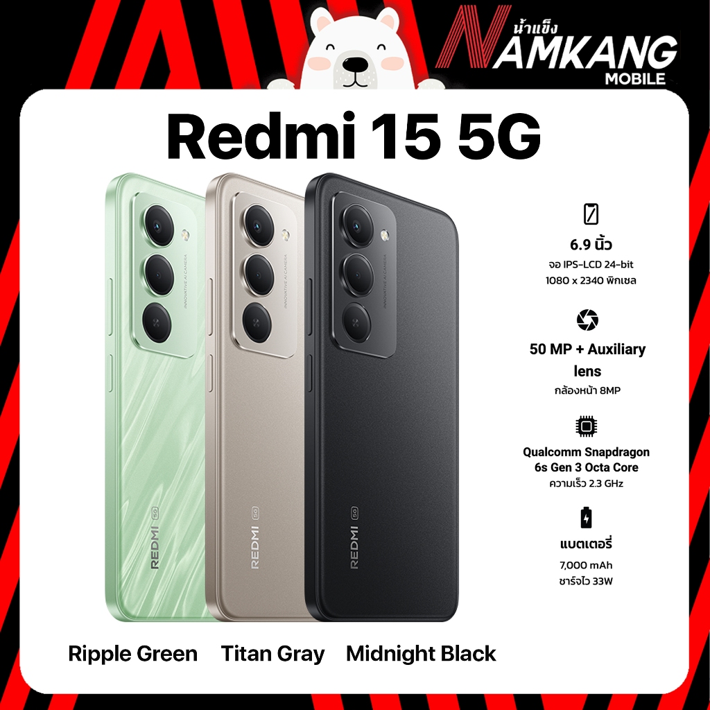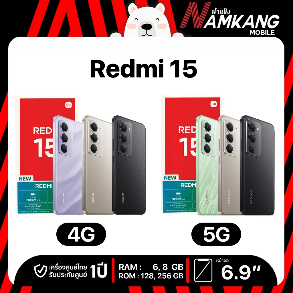 Redmi 15 4G, Redmi 15 5G 8/256GB หน้าจอ 6.9นิ้ว ความละเอียดHD+ แบตเตอรี่ 7000mAh ชาร์จไว 33W เครื่องใหม่ ประกัน 1 ปี
