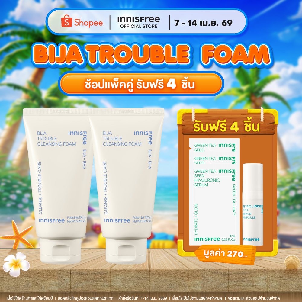 [แพ็คคู่แถม 4 ชิ้น ] innisfree Bija trouble facial Foam 150 ml. โฟมสำหรับผิวมัน ผิวเป็นสิว ลดสิ วอุดตัน