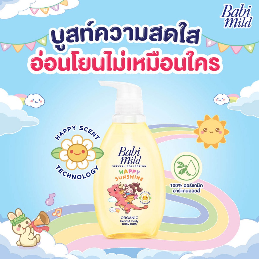 เบบี้มายด์ สบู่เหลวอาบและสระ แฮปปี้ ซันชายน์ 800 มล+รีฟิล ไบโอแกนิก350 มล x2 / Babi Mild Bath Happy Sunshine 800 ml