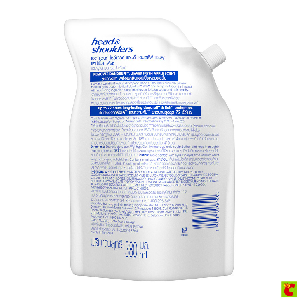 เฮดแอนด์โชว์เดอร์ แชมพูขจัดรังแค สูตรแอปเปิ้ลเฟรช แบบรีฟิล 380 มล.