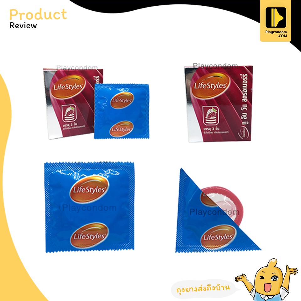 LifeStyles Strawberry 2 in 1 ถุงยางอนามัย กลิ่นสตรอเบอร์รี่ ผิวไม่เรียบ แบบขีด ขนาด 52 มม. บรรจุ 1 กล่อง (3 ชิ้น)