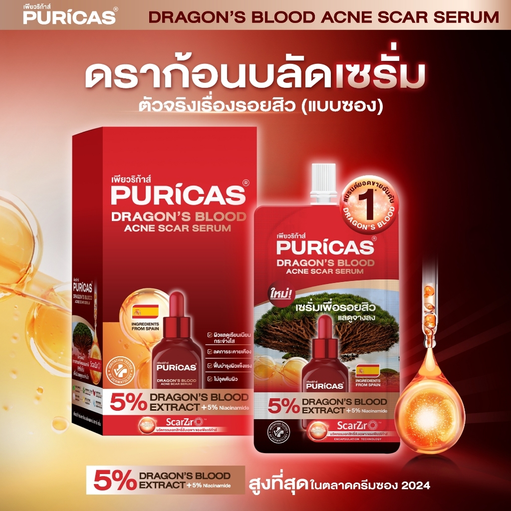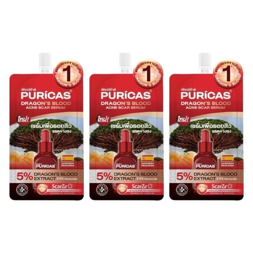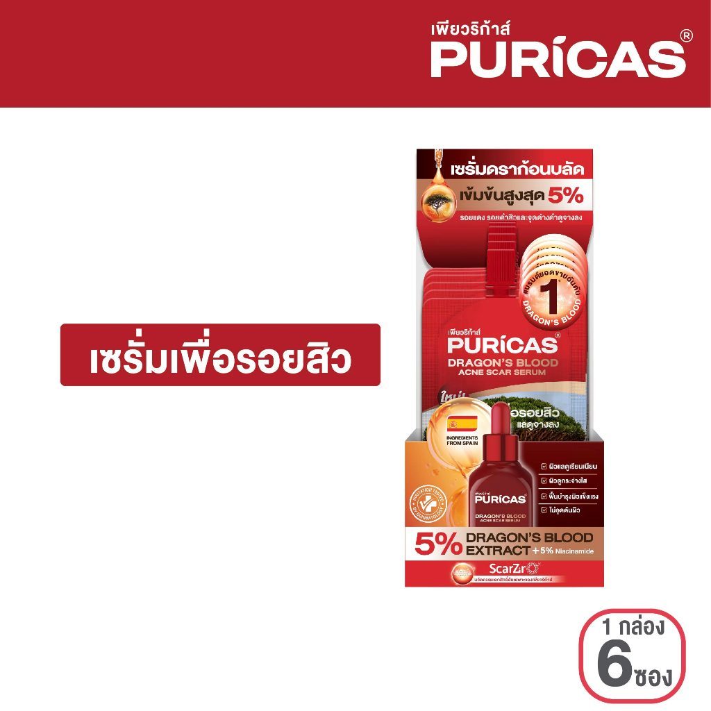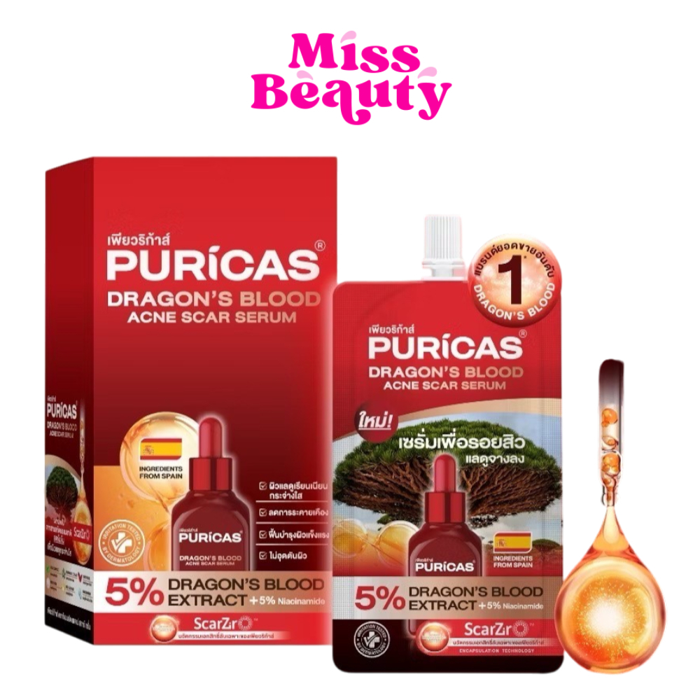 เพียวริก้าส์ ดราก้อนบลัด เซรั่มเพื่อรอยสิว Puricas Dragon's Blood Acne Scar Serum 7มล (ยกกล่อง 6 ซอง)