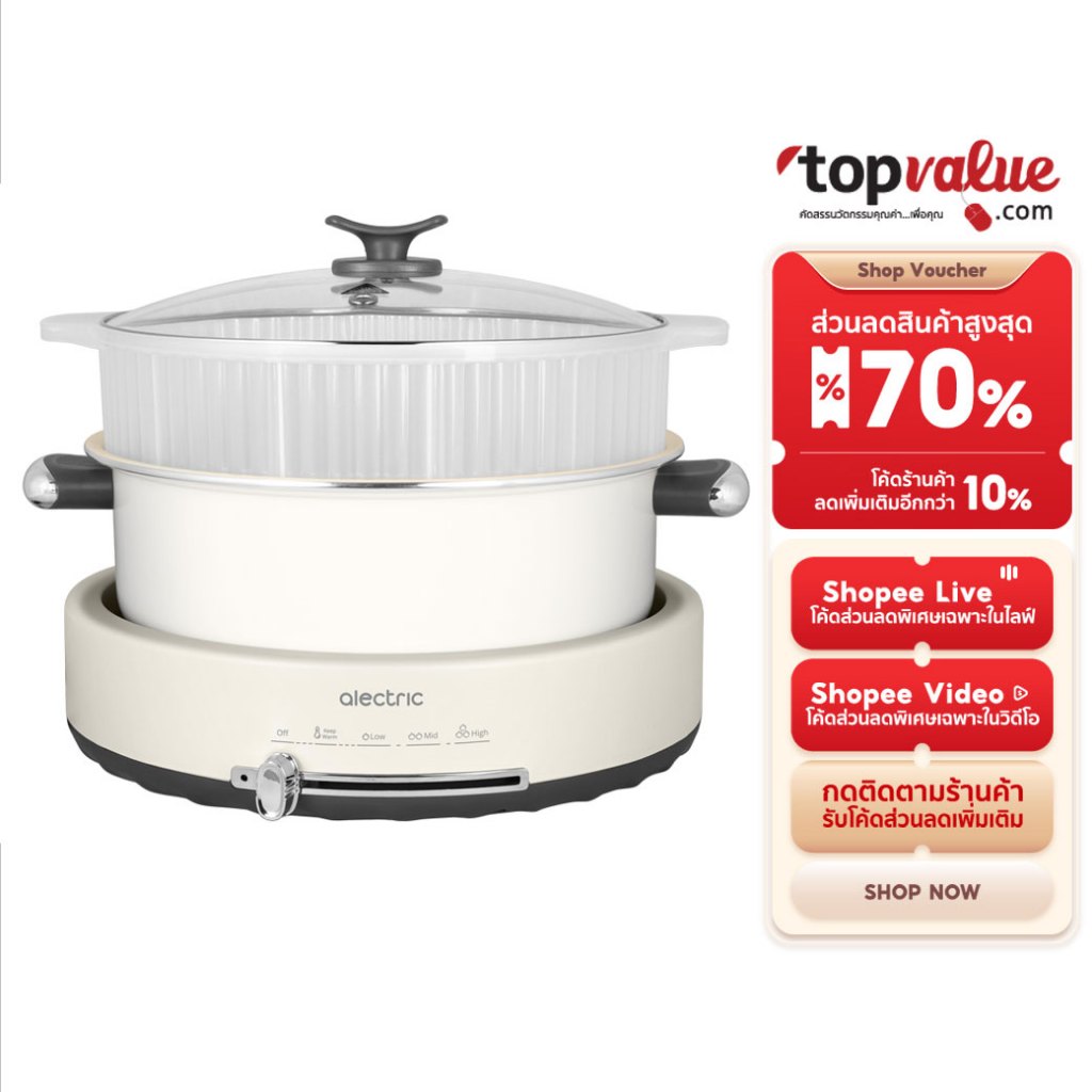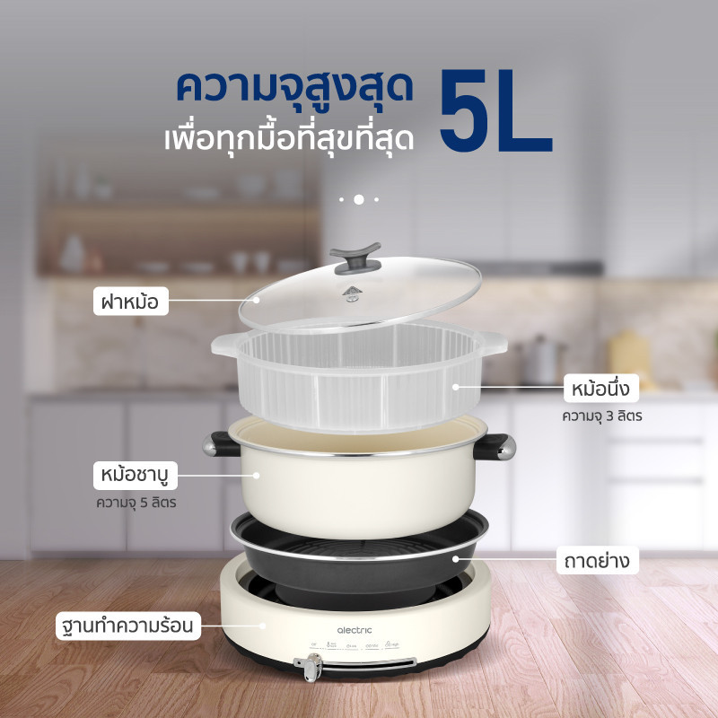 Alectric หม้อไฟฟ้าอเนกประสงค์ ชาบู ปิ้งย่าง นึ่ง 5 ลิตร รุ่น ST-1 - รับประกัน 3 ปี
