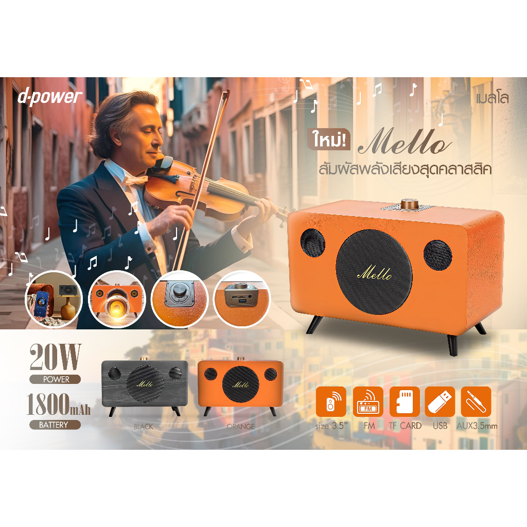 Mello d-power ลำโพงบลูทูธมินิ ลำโพงตู้ไม้ คลาสสิค เรียบหรู กำลังขับ 20 วัตต์แบตเตอรี่ในตัว
