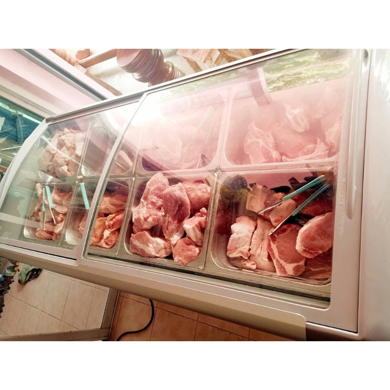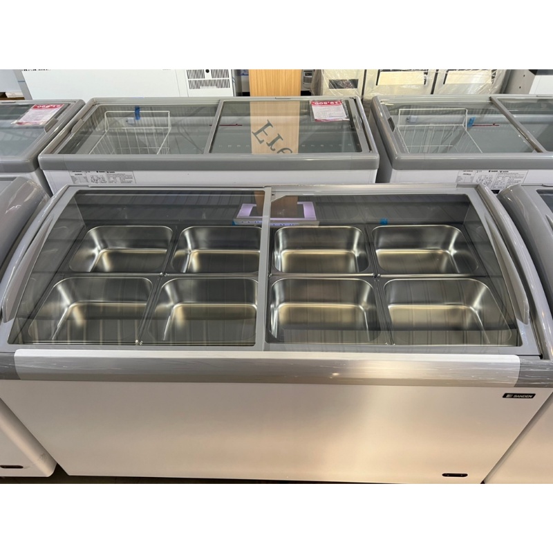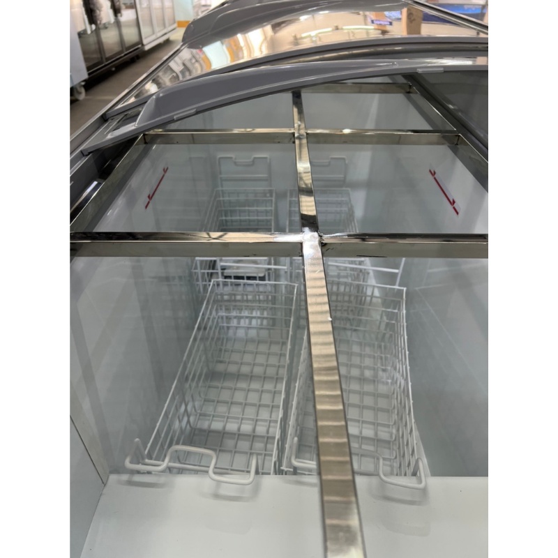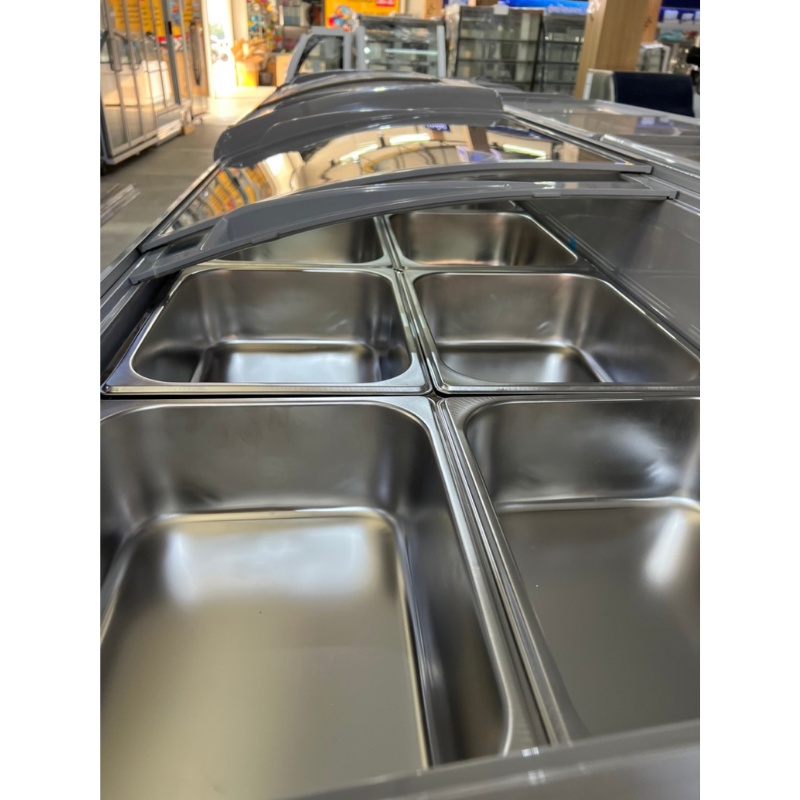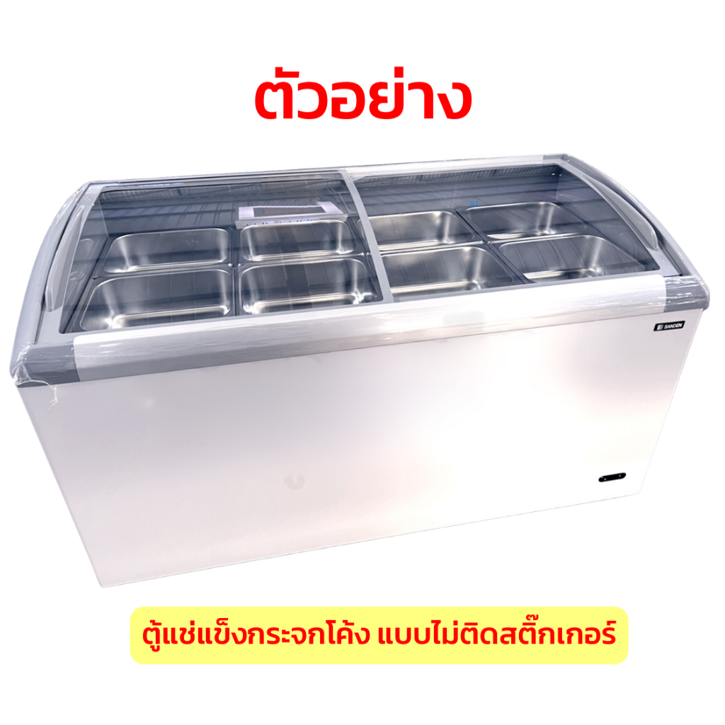ตู้แช่แข็งกระจกโค้ง ตู้แช่หมูกระทะ + ถาดสแตนเลส 8 ชิ้นพร้อมโครงเหล็ก Sanden รุ่น SNC-0435 ขนาด 15 Q