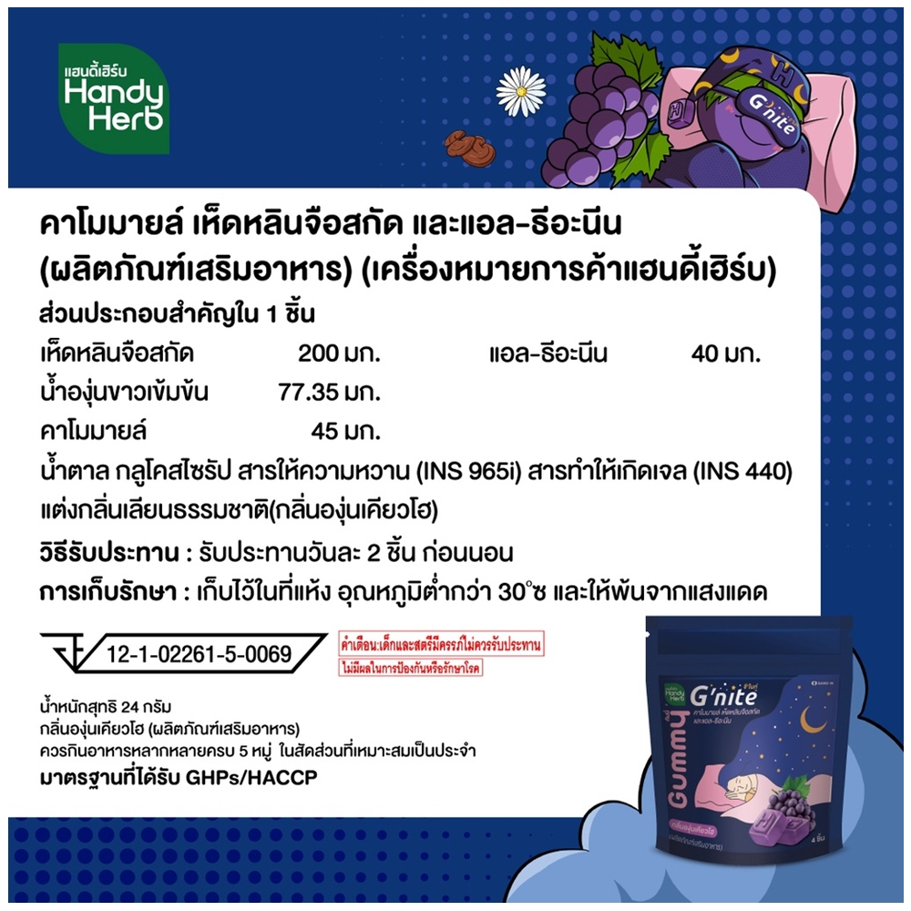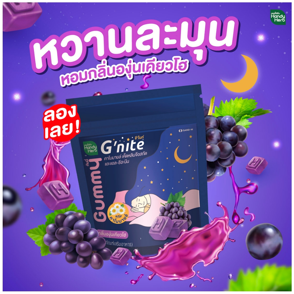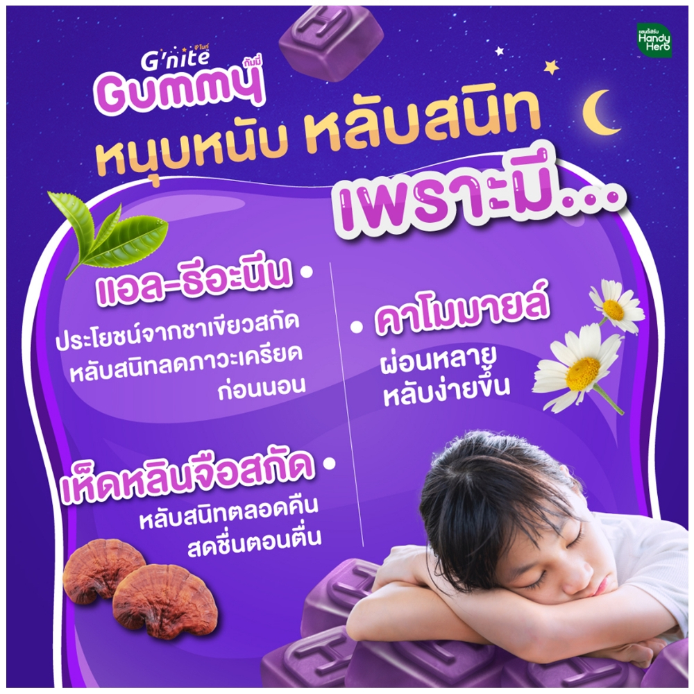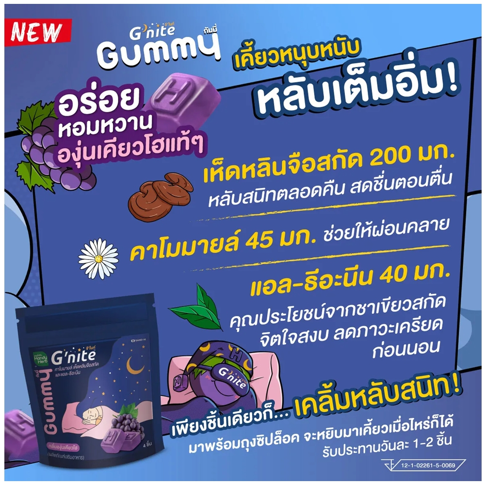 HandyHerb G-nite Gummy 4 Pcs./sachet - จีไนท์ กัมมี่ เยลลี่ คาโมมายล์ เห็ดหลินจือสกัด และเเอล-ธีอะนีน 4ชิ้น/ซอง