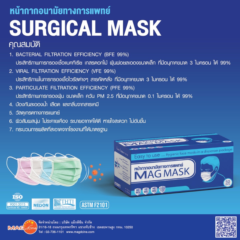 MAG Mask หน้ากากอนามัยทางการแพทย์ หนานุ่ม ระบายอากาศดี กล่องละ50ชิ้น(เขียว ขาว ฟ้า ชมพู)