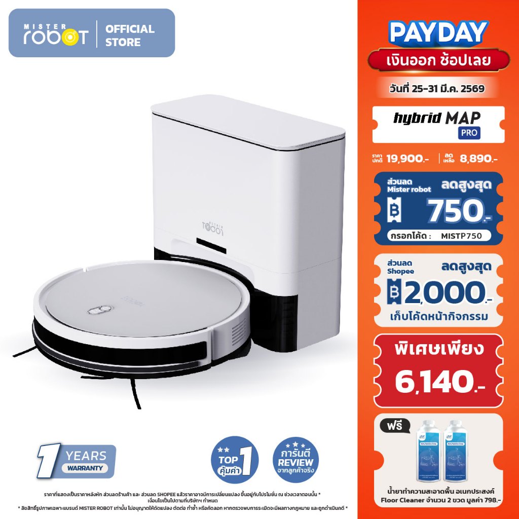 Mister Robot หุ่นยนต์ดูดฝุ่น หุ่นยนต์ถูพื้น เก็บฝุ่นอัตโนมัติ รุ่น HYBRID MAP PRO แถมฟรี! น้ำยาทำความสะอาดอเนกประสงค์