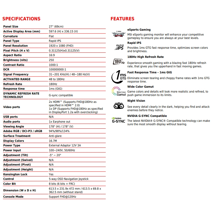 MSI G274F Monitor (27'' 180Hz, Rapid IPS, FHD) จอคอมพิวเตอร์ จอมอนิเตอร์