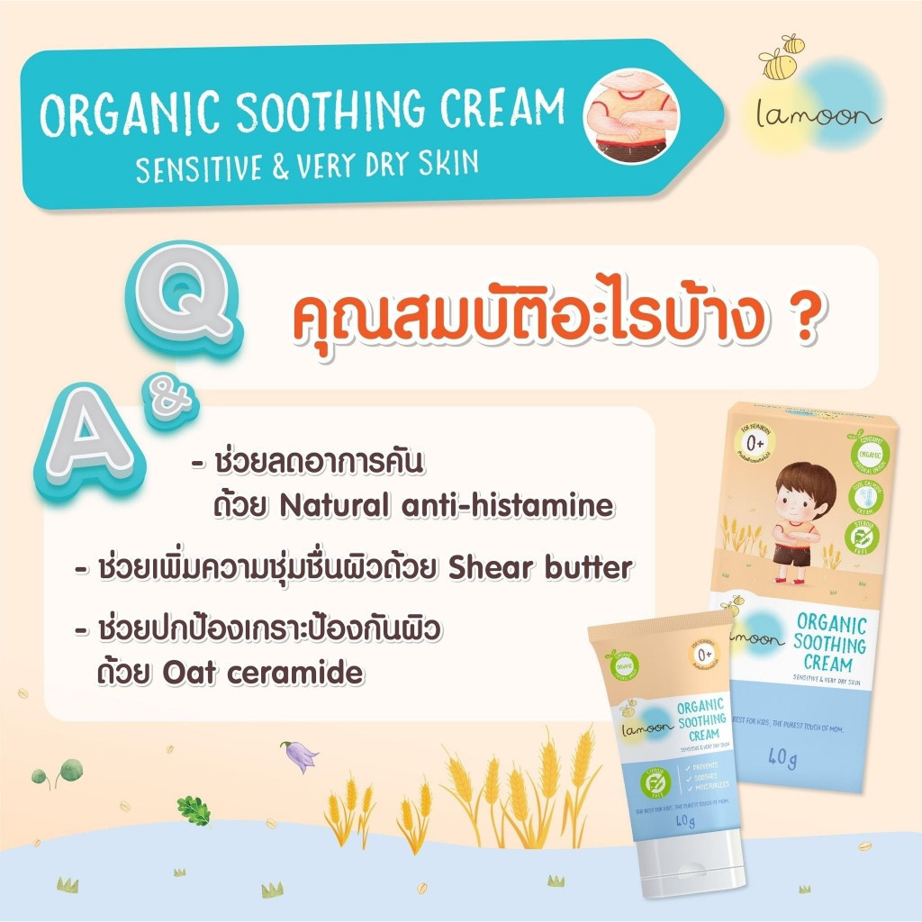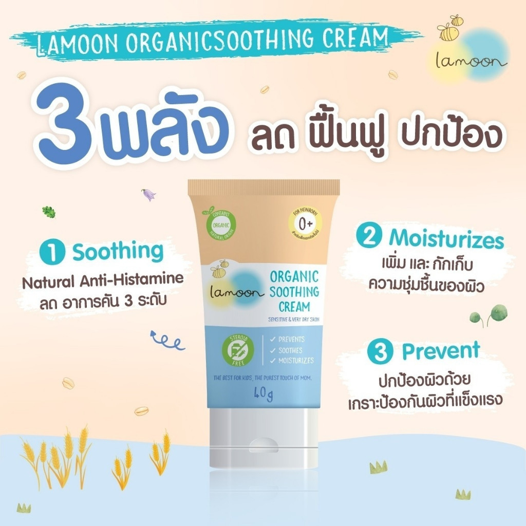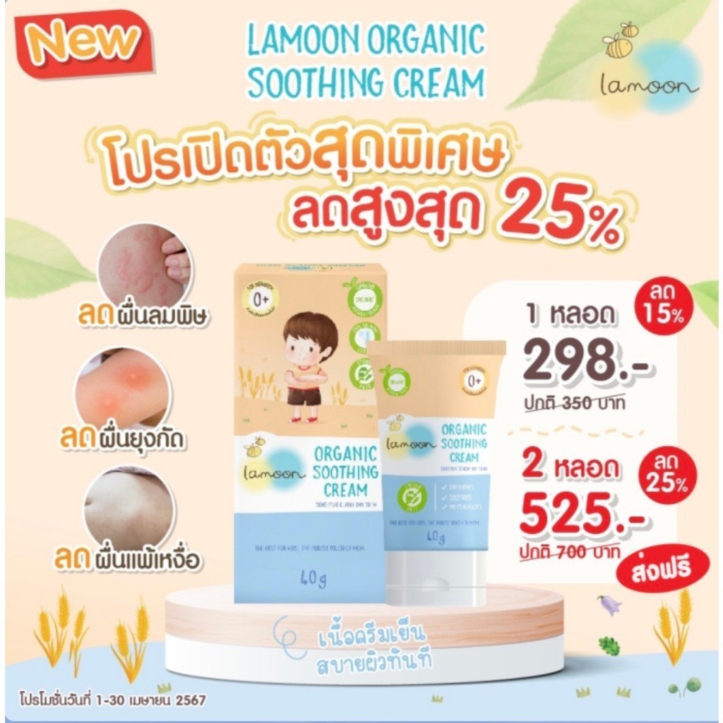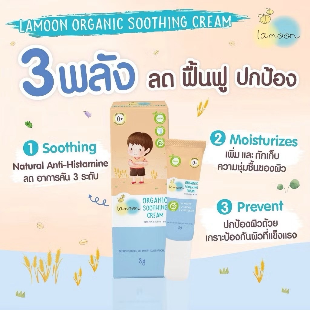 Lamoon Soothing Cream ครีมลดผื่น ลดคัน ผื่นผ้าอ้อม ภูมิแพ้ ผื่นร้อน ตุ่มจากยุงมดแมลงกัด ออร์แกนิก ไม่มีสเตียรอยด์ ละมุน