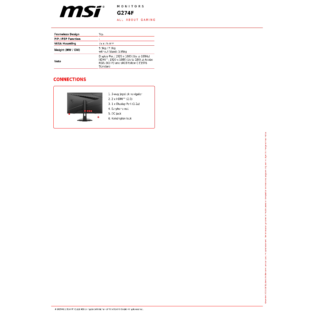MSI Monitor G274F 27" IPS FHD ,180Hz (1ms, DP, HDMI) DCI-P3 98%,SRGB 134% ประกันศูนย์ MSI 3 ปี