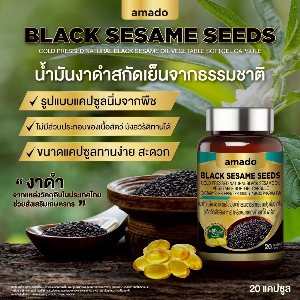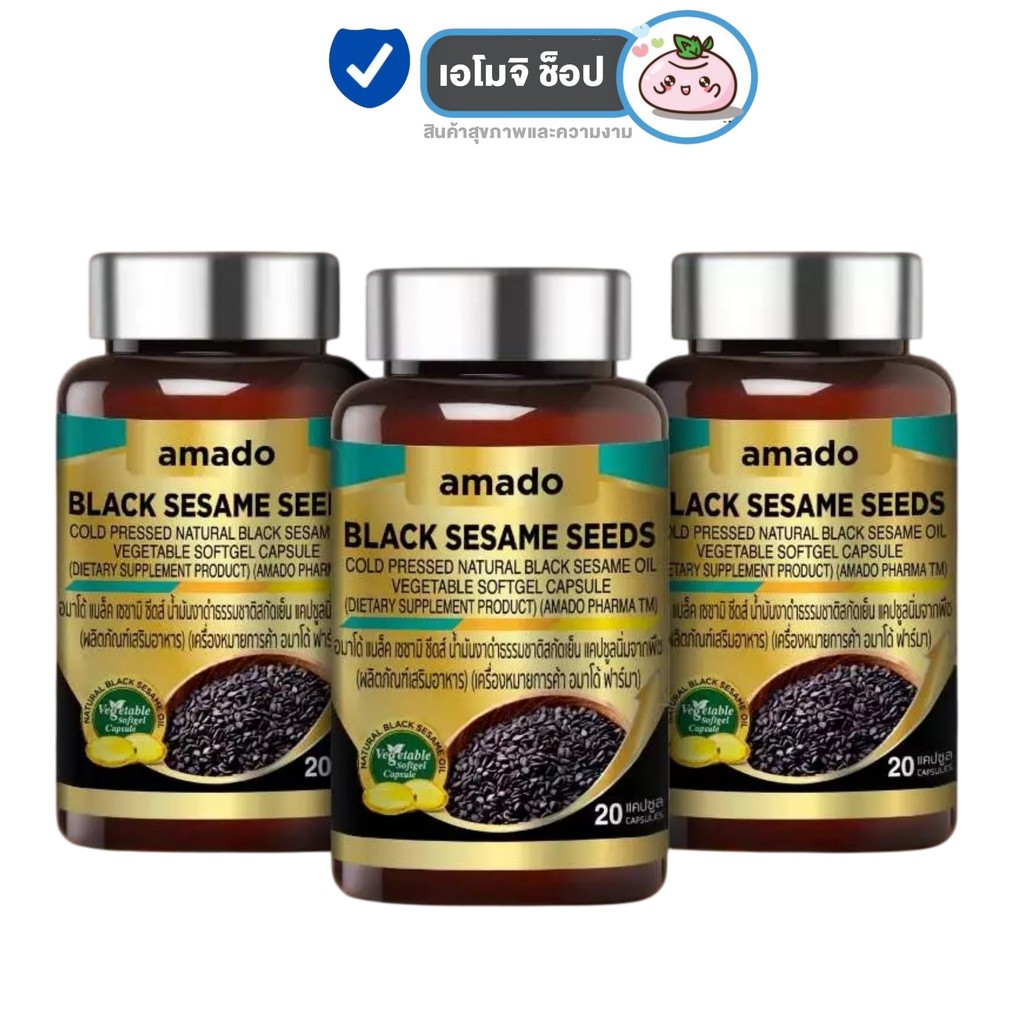 Amado Black Sesame Seeds อมาโด้ น้ำมันงาดำ [20 แคปซูล] [3 กระปุก] ดูแลสุขภาพ บำรุงกระดูกและข้อต่อ ดูแลหัวใจและสมอง