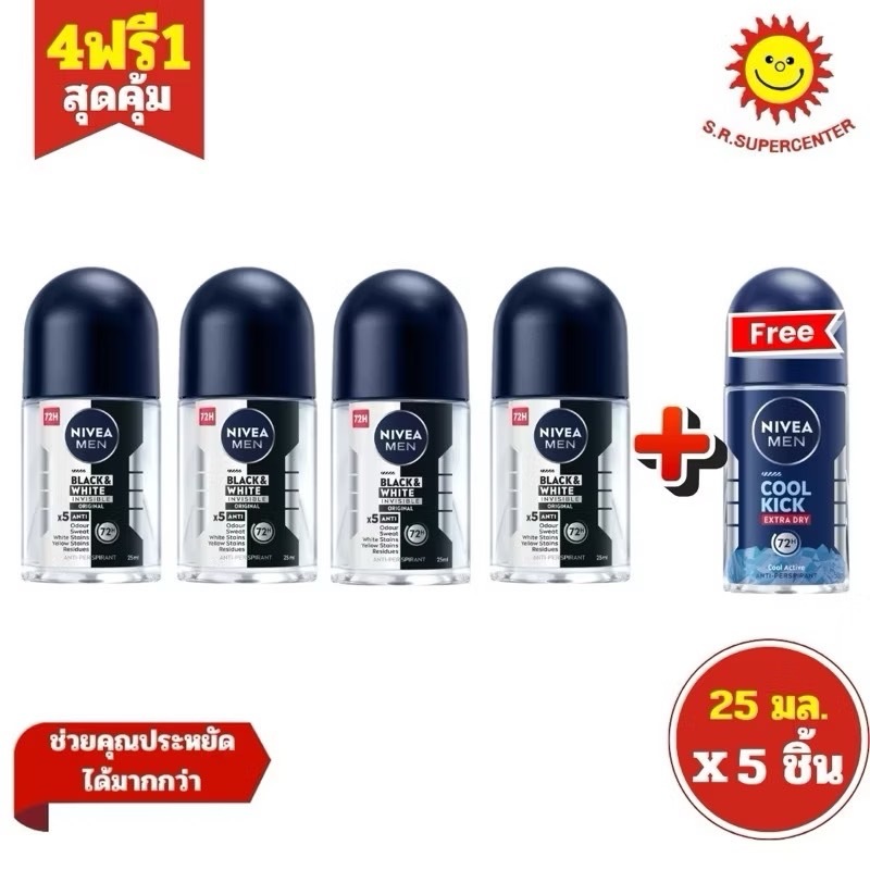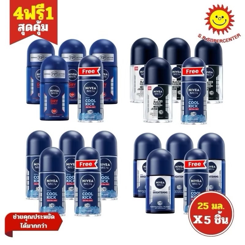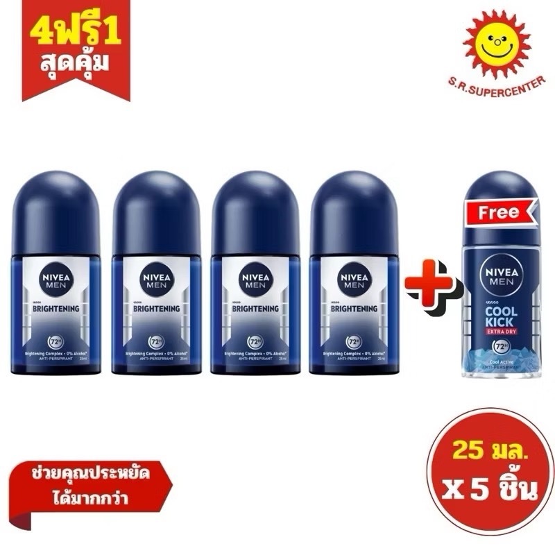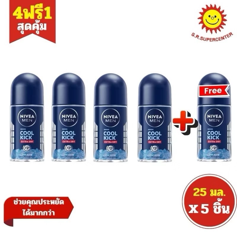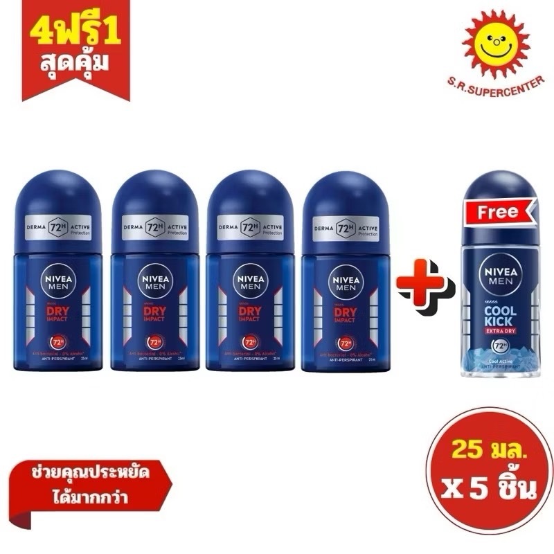 (4+1) Nivea Men Dry Impact + Cool Kick นีเวียเมน โรลออน ดรายอิมแพ็ค 25 มล. 4ขวด+ นีเวียเมนโรลออนคูลคิก 1ขวด25มล.