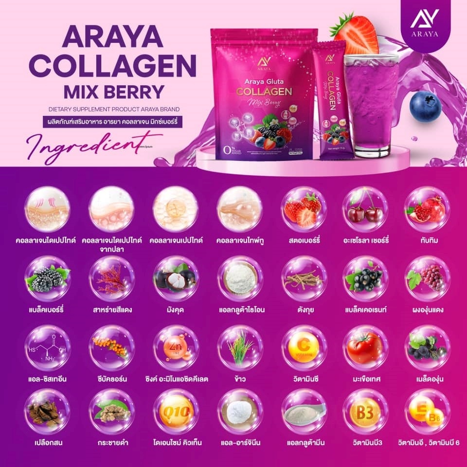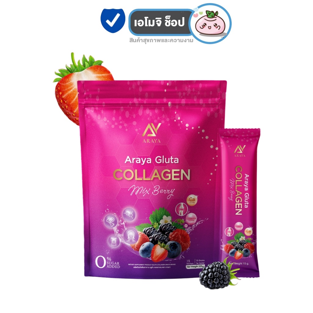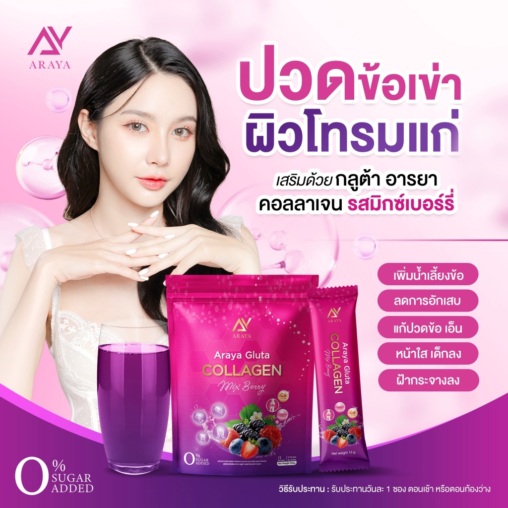 Araya Gluta Collagen Mix Berry อารยา กลูต้า คอลลาเจน มิกซ์เบอร์รี่ [15 ซอง] [1 ห่อ] อารยา คอลลาเจน กระดูก น้ำชงกลูต้า