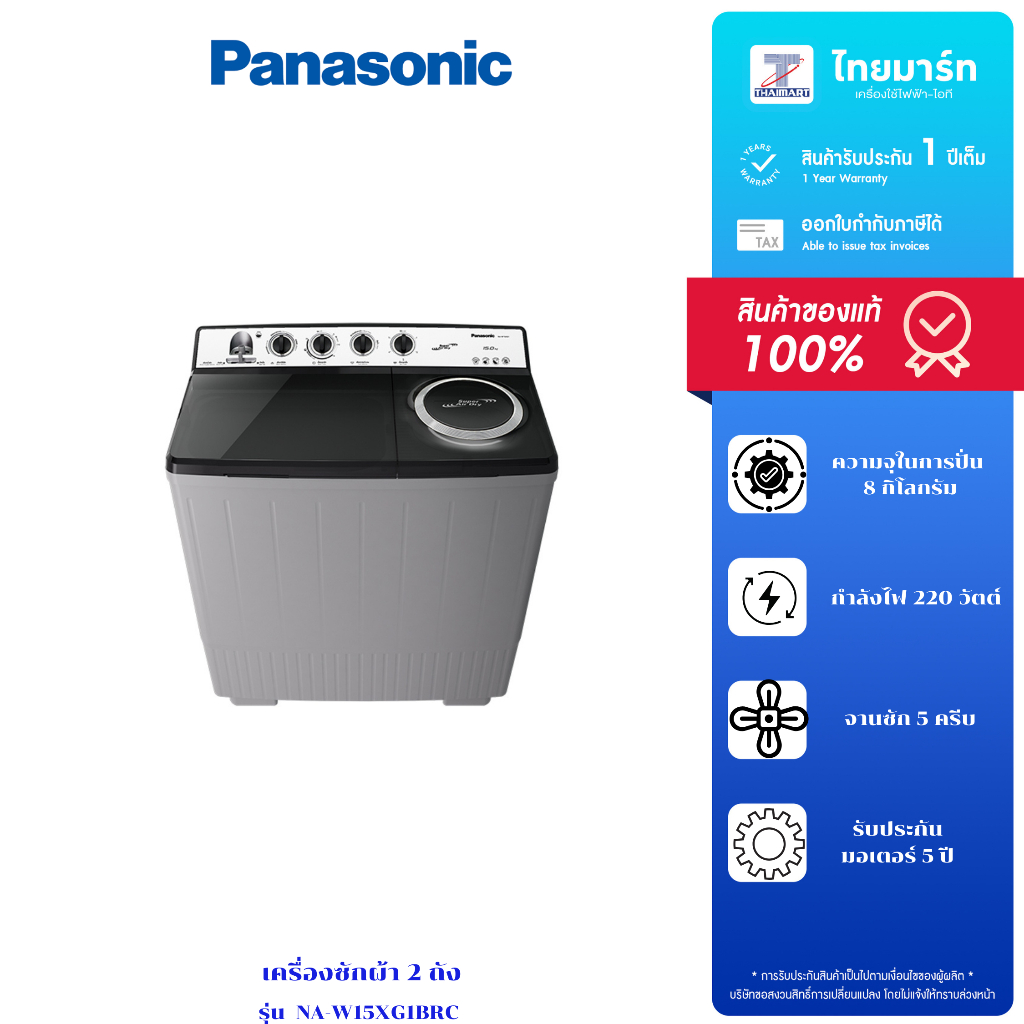 PANASONIC เครื่องซักผ้า 2 ถัง 15 กิโลกรัม รุ่น NA-W15XG1BRC รับประกันสินค้า 1 ปี