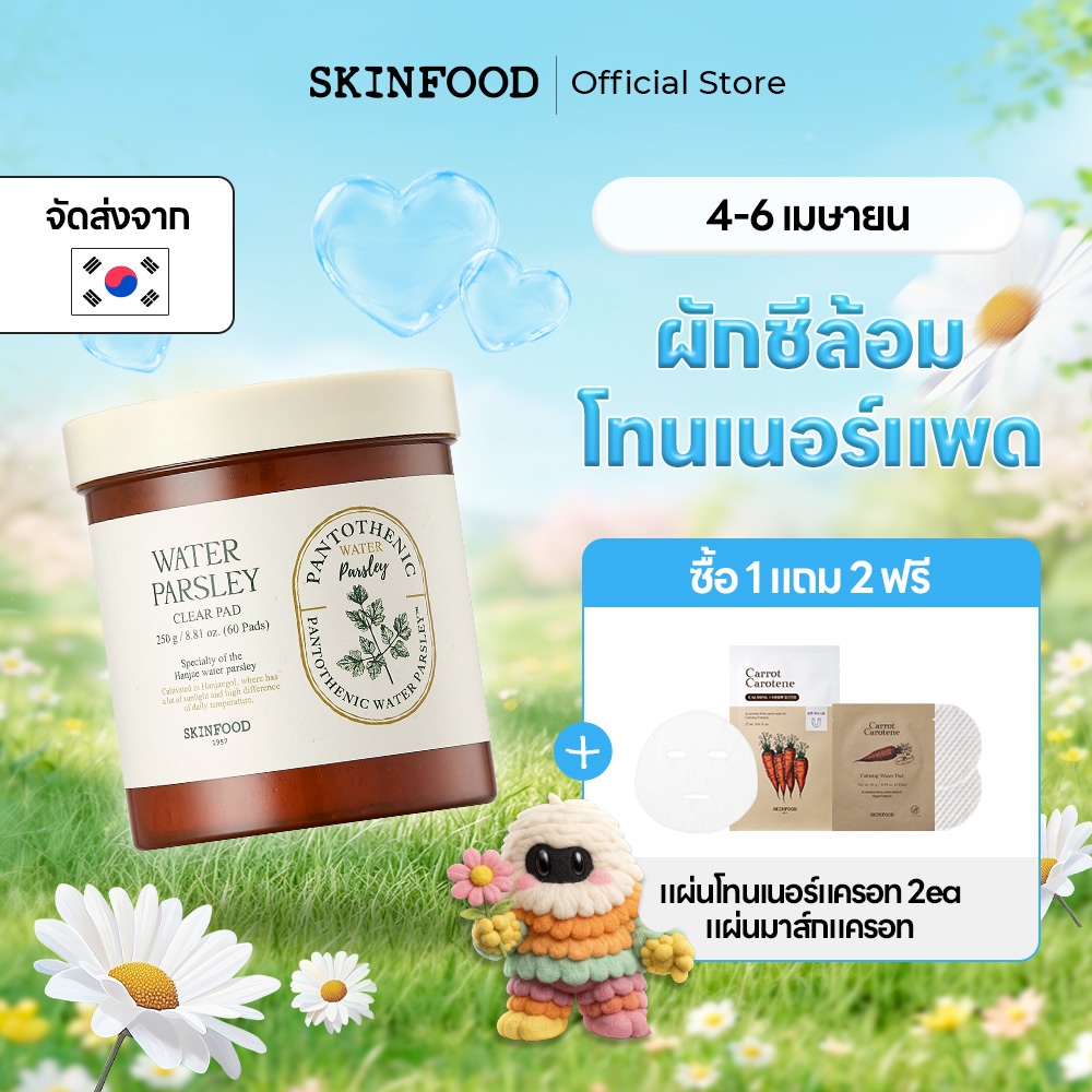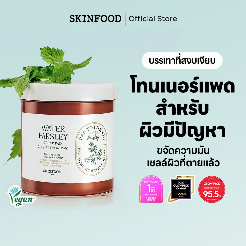 [SKINFOOD Official] โทนเนอร์แพดพาร์สลีย์ 60 ชิ้น / ควบคุมความมัน & ลดการระคายเคือง / ดูแลผิวที่เป็นสิวง่าย / วิตามิน B5 & กรด / Pantothenic Water Parsley Clear Pad / Toner Pad