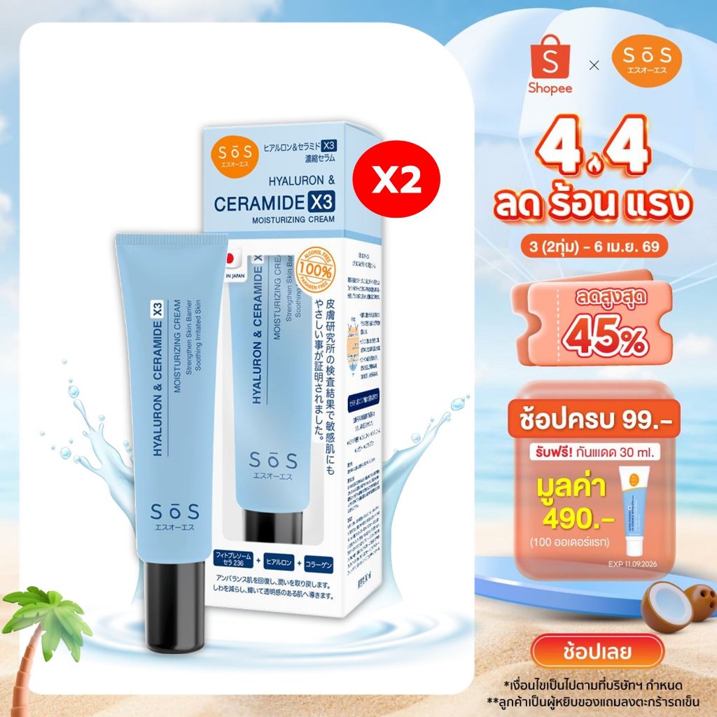 [แพ็ค 2] SOS ไฮยาลูรอน & เซราไมด์ เอ็กซ์ 3 มอยส์เจอร์ไรซิ่ง ครีม 30 มล. Hyaluron & Ceramide X3 Moisturizing Cream