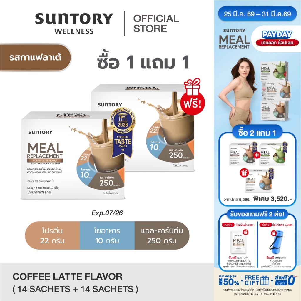 [1 แถม 1] Meal Replacement (Suntory MRP) ผลิตภัณฑ์ทดแทนมื้ออาหาร - รสกาแฟลาเต้ (14 ซอง/ กล่อง) exp.07/26