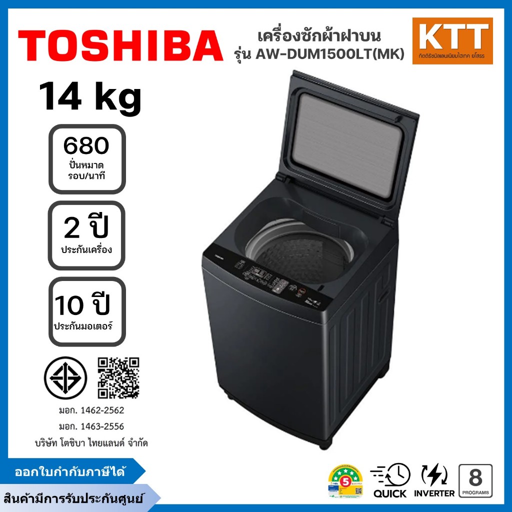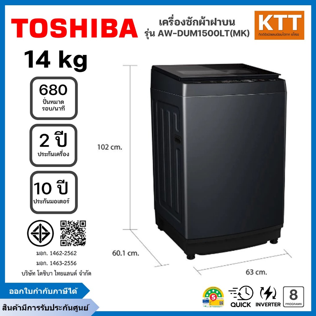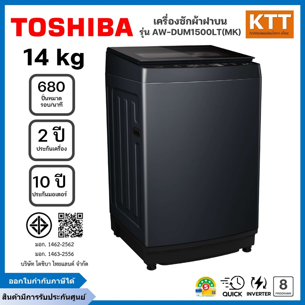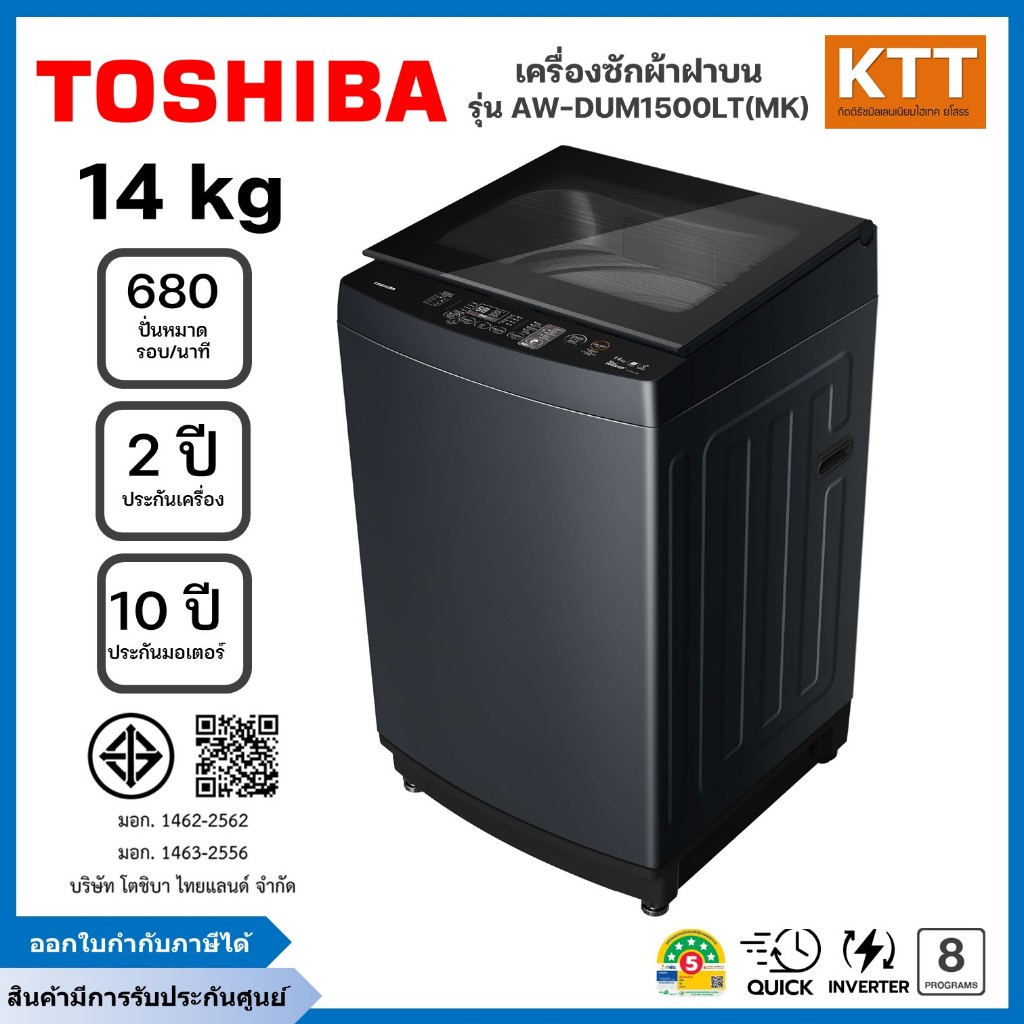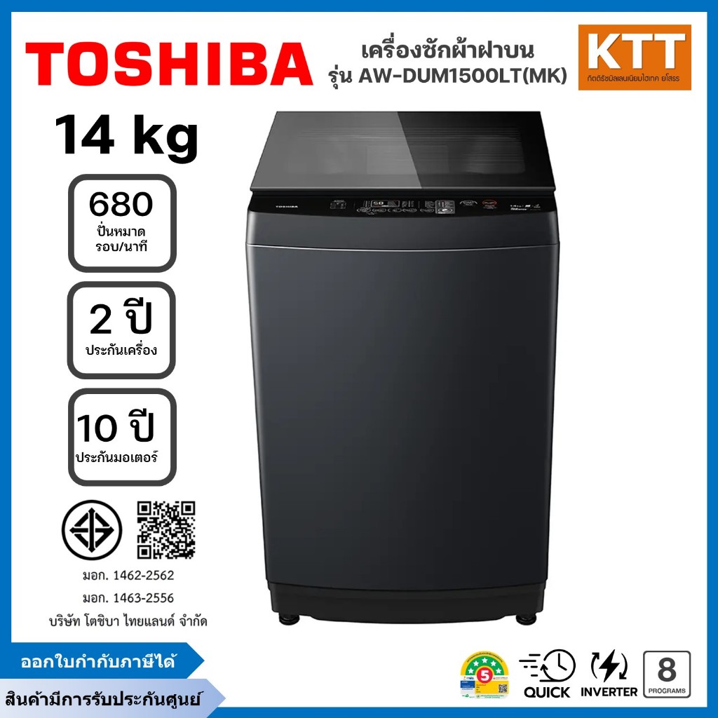TOSHIBA เครื่องซักผ้าฝาบน รุ่น AW-DUM1500LT(MK) ขนาด 14 กก Inverter