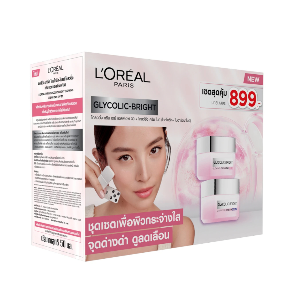 [1 เซ็ต] L'Oréal ลอรีอัล ปารีส โกลวอิ้ง ไกลโคลิค ครีม เดย์ เอสพีเอฟ + โกลวอิ้ง ไกลโคลิค ครีม ไนท์ 50+50 มล