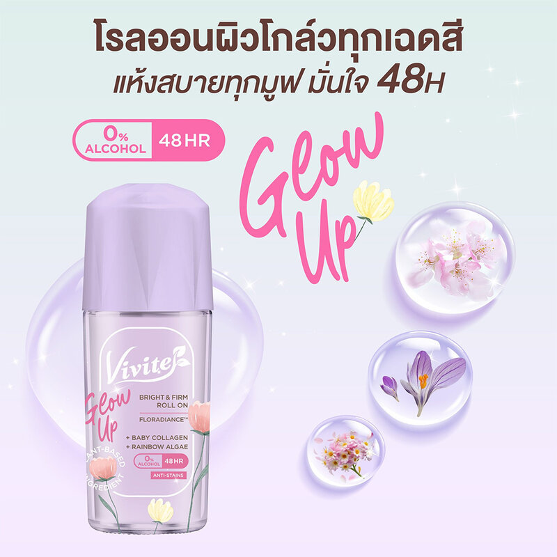 Vivite Glow Up White & Firm Roll On 20ml ผลิตภัณฑ์ระงับกลิ่นกาย วีไวต์ วงแขนดูกระจ่างใส หอม ไร้คราบ 0% Alcohol.