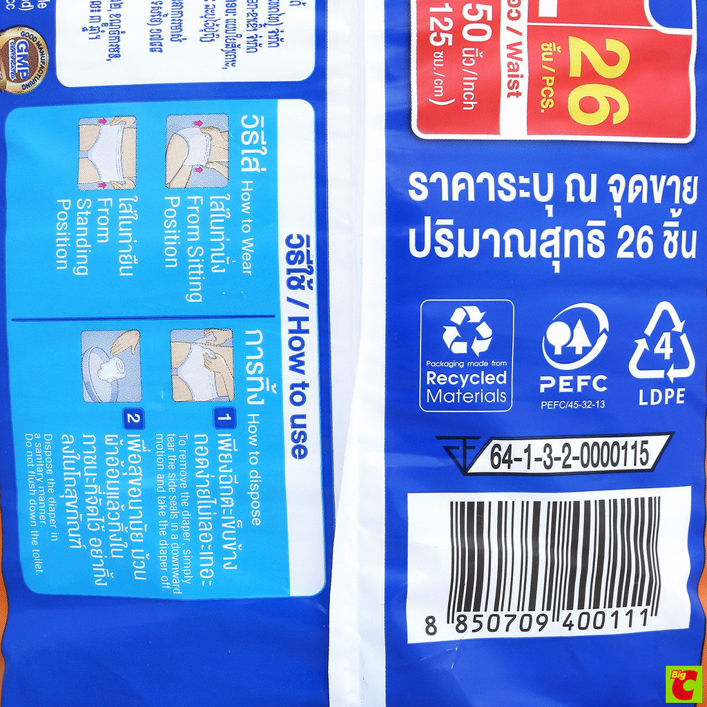 เซอร์เทนตี้ เดย์แพ้นส์ กางเกงผ้าอ้อมผู้ใหญ่ ซึมซับปกติ ขนาด XL 26 ชิ้น