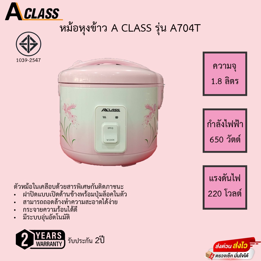 หม้อหุงข้าวอุ่นทิพย์ Aclass 1.8 ลิตร รุ่น A704T มีซึ้งนึ่ง รับประกัน 2ปี เสียเปลี่ยนเครื่องใหม่ได้