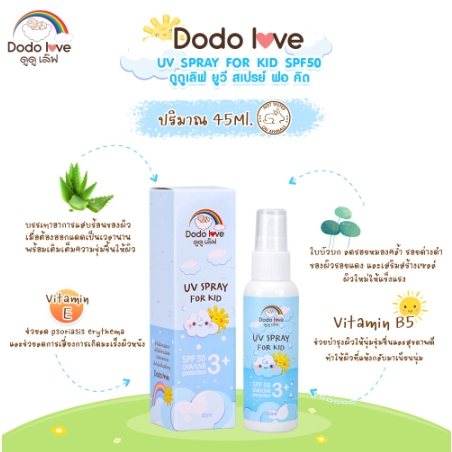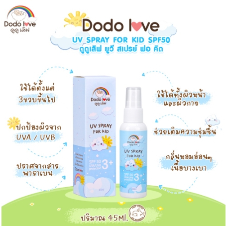 สเปรย์กันแดด DODOLOVE สำหรับเ ด็ก UV SPRAY FOR KID SPF50 ปกป้องผิวจากรังสี UVA และ UVB 45 ml.