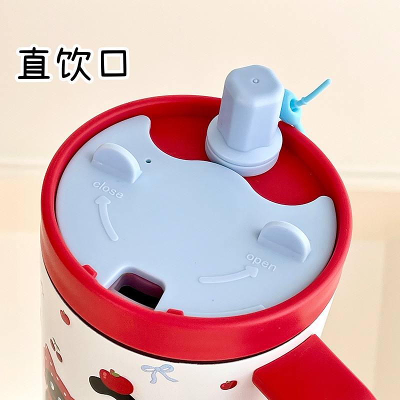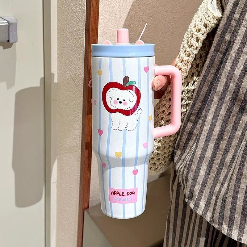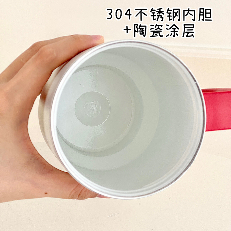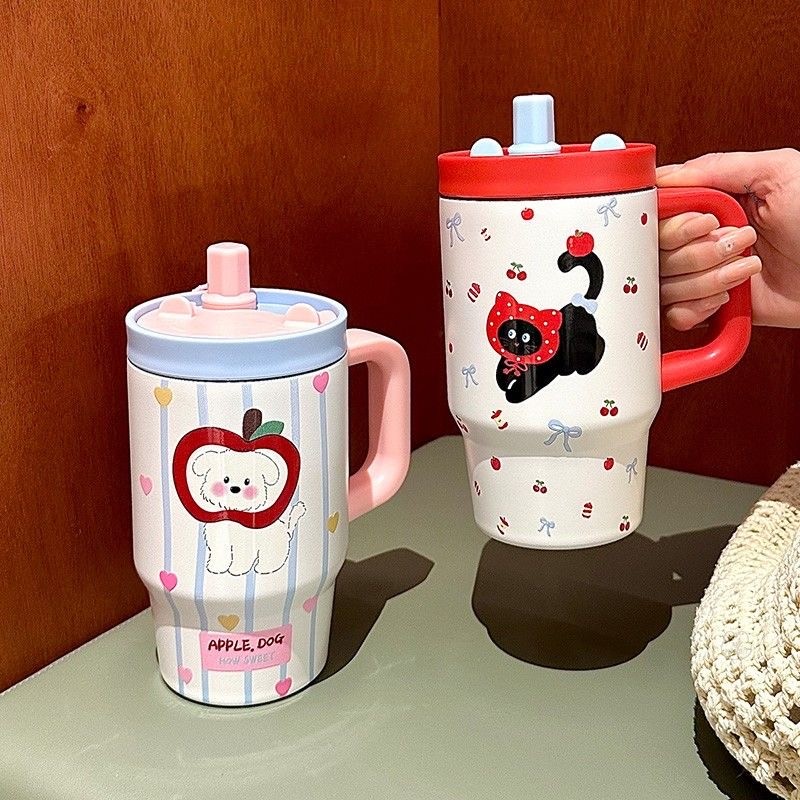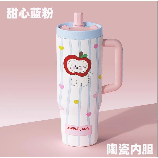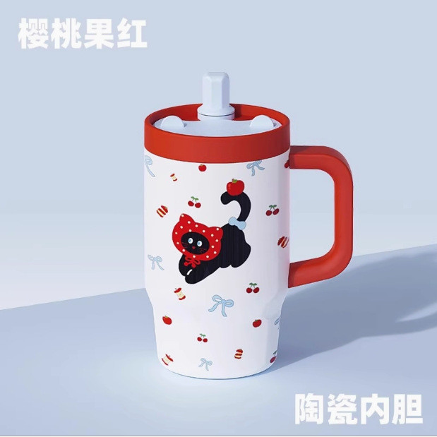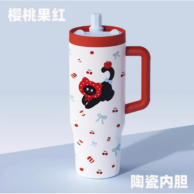 【LUCKY】เคลือบเซรามิกซับถ้วยเก็บความร้อนความจุขนาดใหญ่พร้อมที่จับ304สแตนเลสคู่ดื่มฟางถ้วยที่มาพร้อมกับถ้วย800มล 1180มล